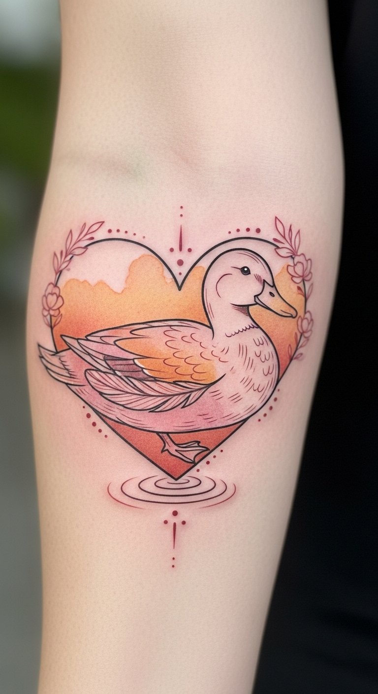 In the domain of tattoo artistry, few symbols convey affection as beautifully as a duck nestled within a heart. This design encapsulates duck symbolism, representing loyalty and love, while the heart signifies deep emotional connections.