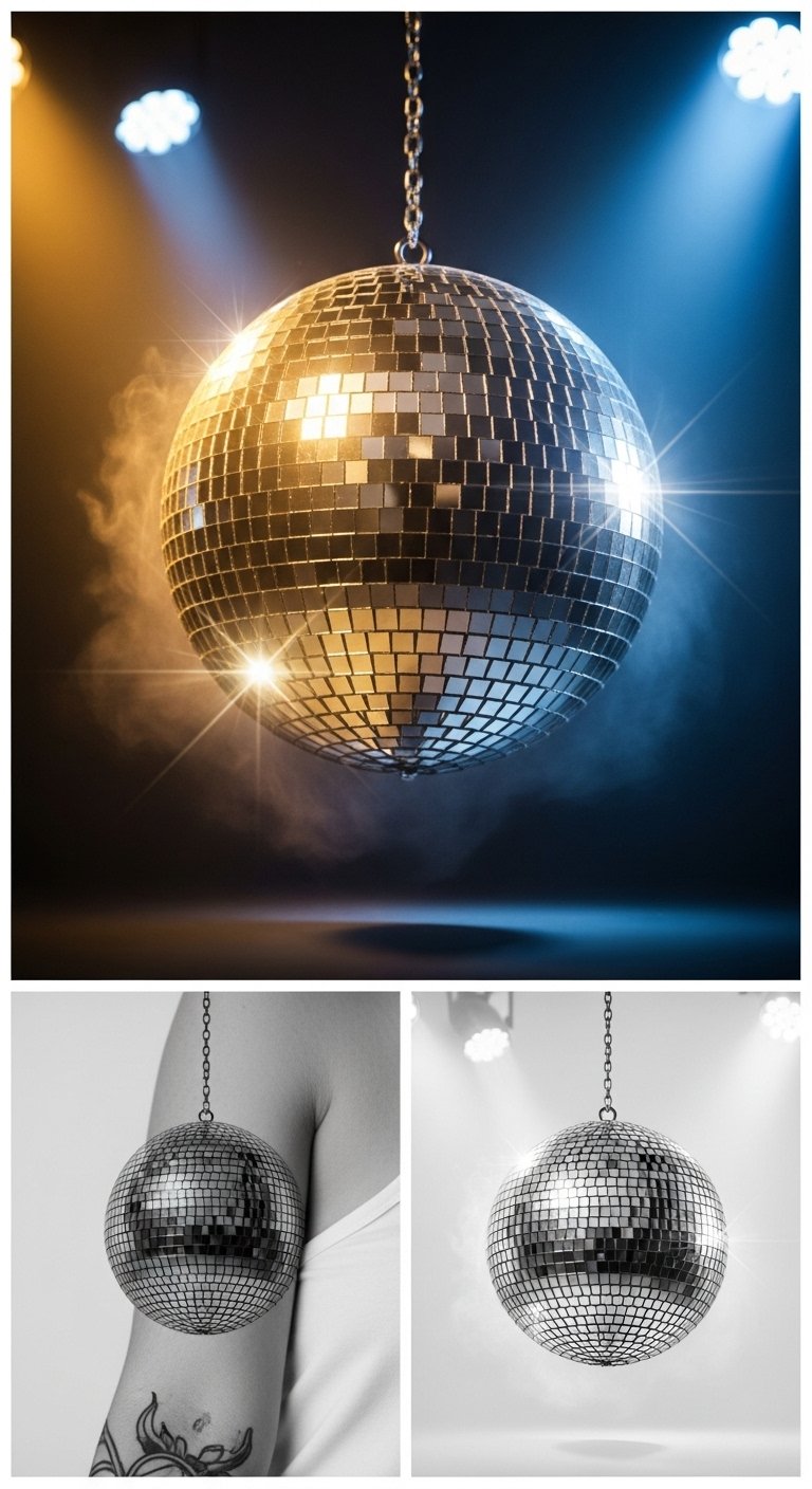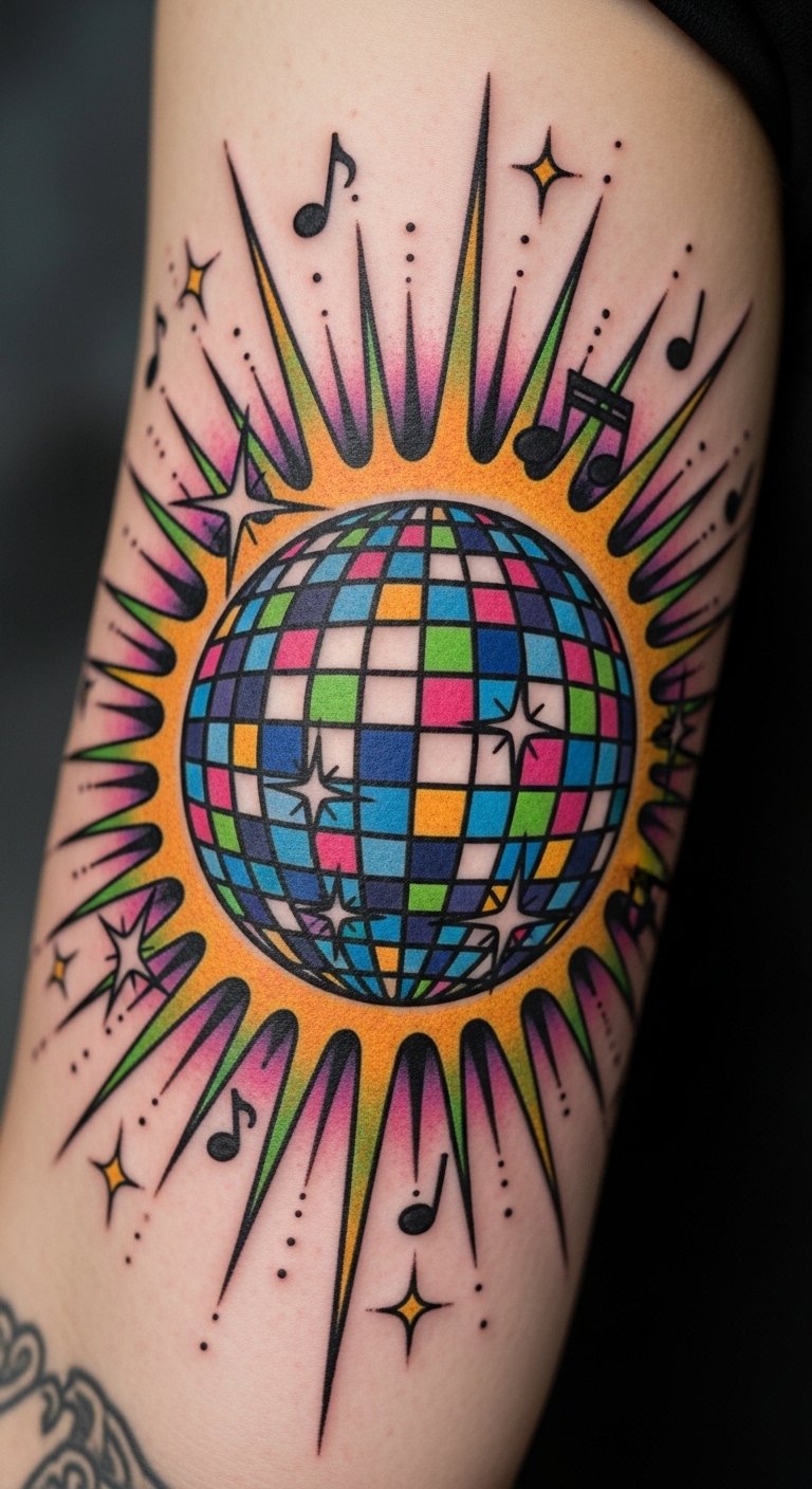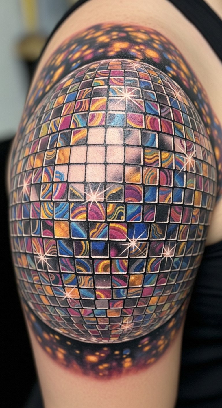 It carries an upbeat, nostalgic emotion—optimistic and radiant—and works well on the upper arm, shoulder blade, or chest where the round disco ball can be centered and the patterns flow outward with the body’s contours.