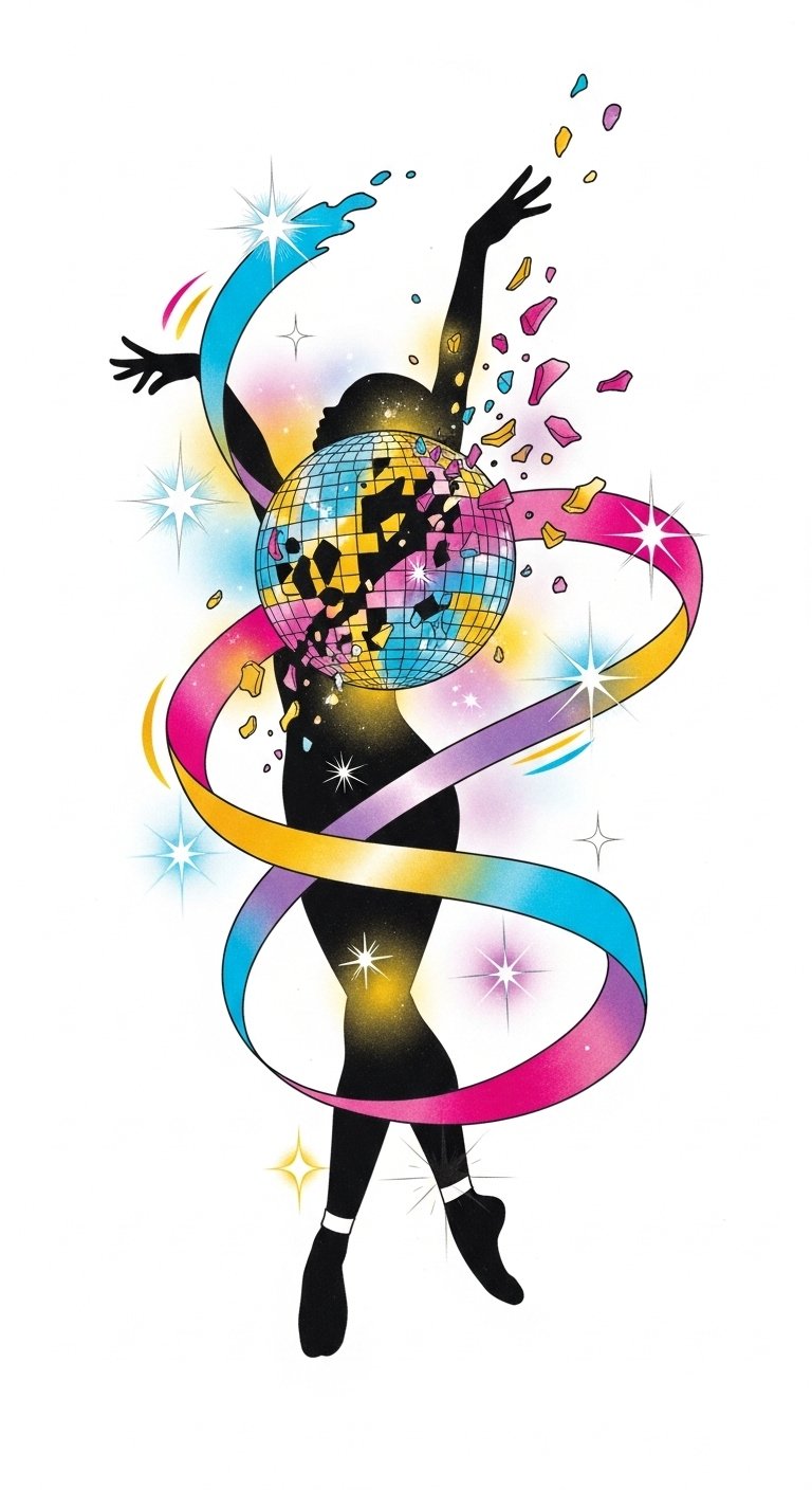 The design symbolizes joyful motion and personal freedom, the shattered disco ball spiral representing fragmented memories recomposed into a new identity; neon colors and bold shapes convey exuberant emotion, while starbursts and motion lines add kinetic energy.