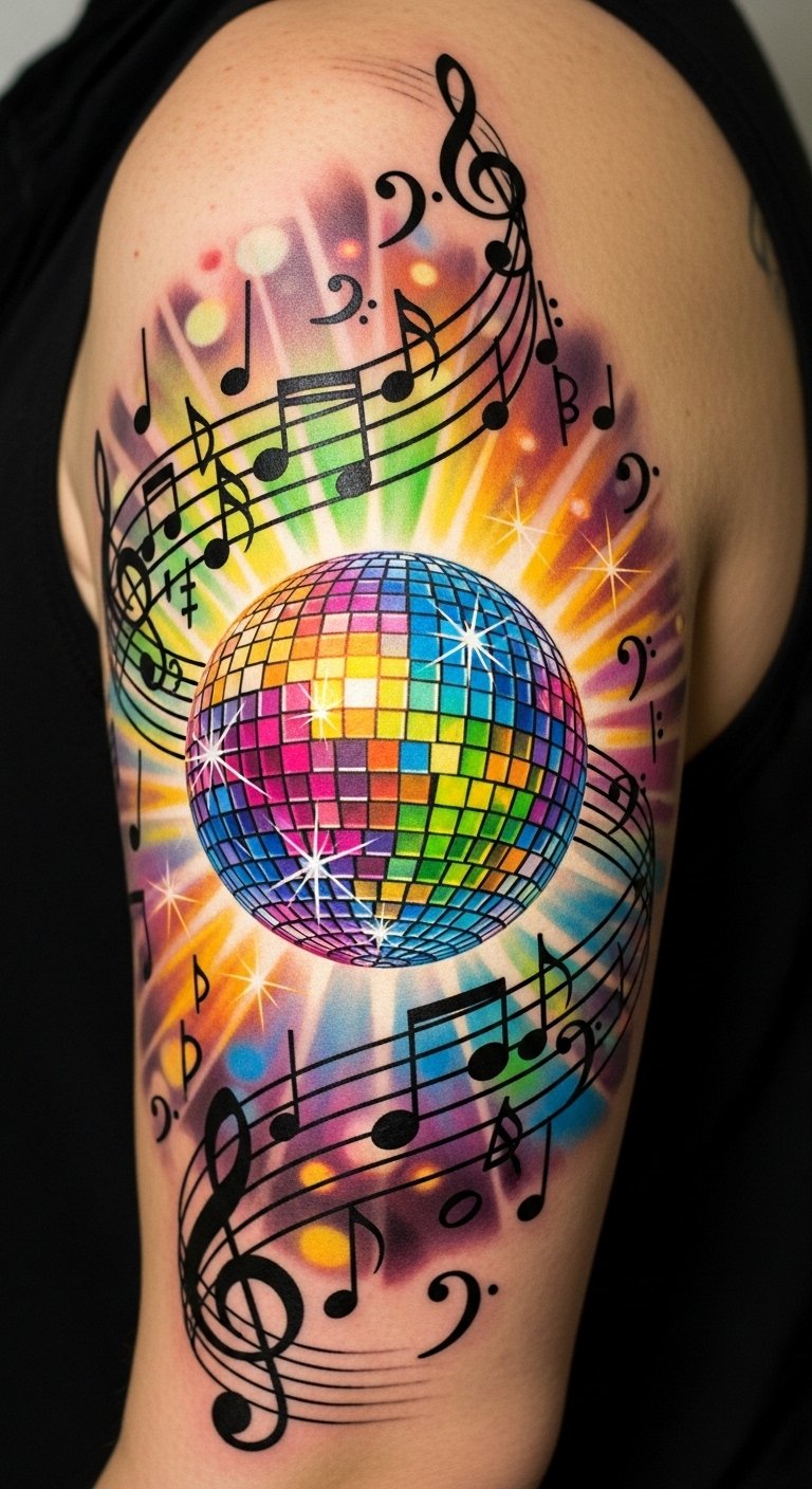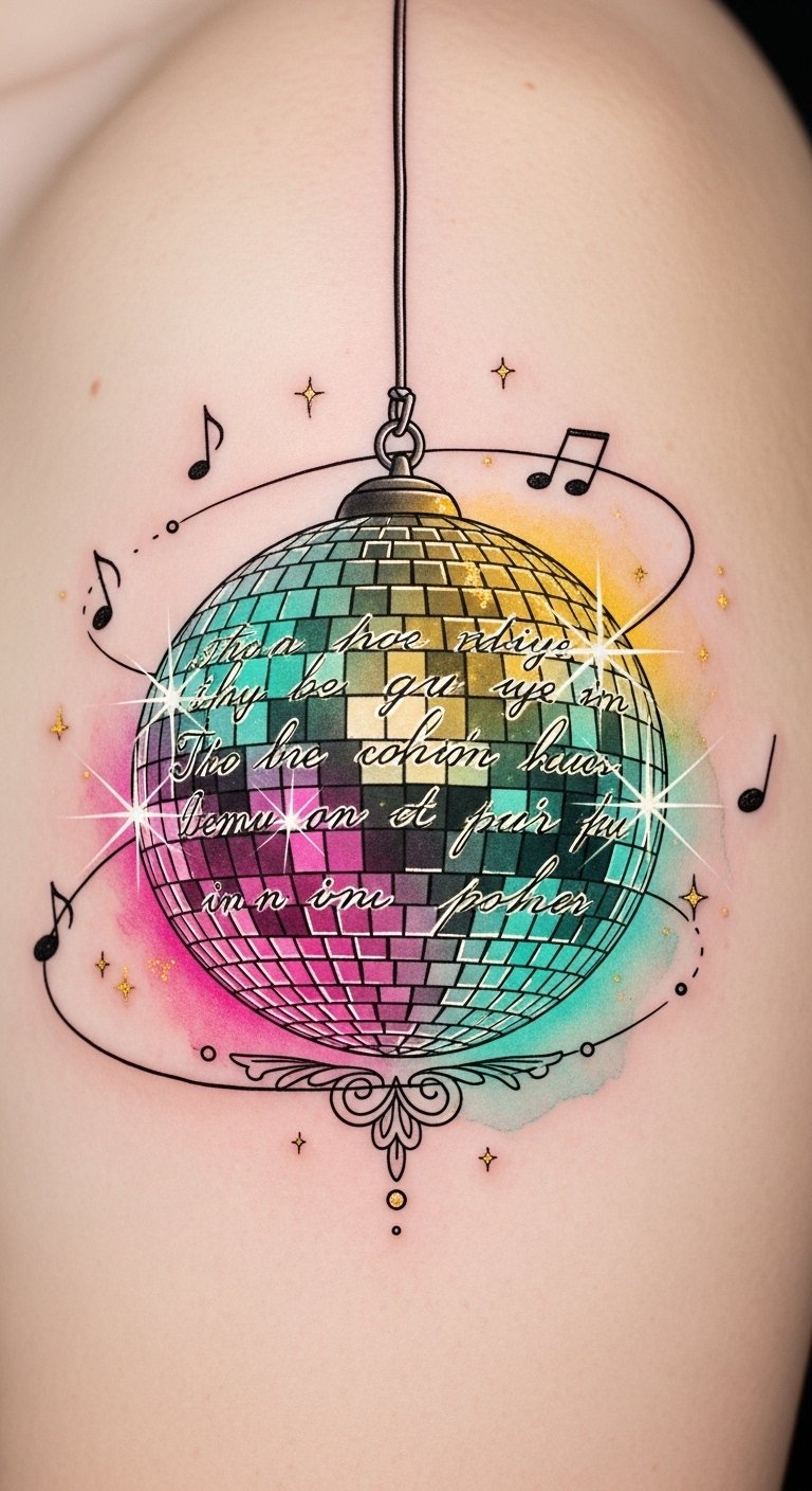 The disco ball symbolizes communal joy and movement, the mirrored lyrics reflect personal stories and memories, and the orbiting notes suggest the constant presence of music; place on the upper arm, chest, or shoulder blade to allow the circular form to catch the eye and flow with the body’s contours, evoking nostalgia, liberation, and connection.