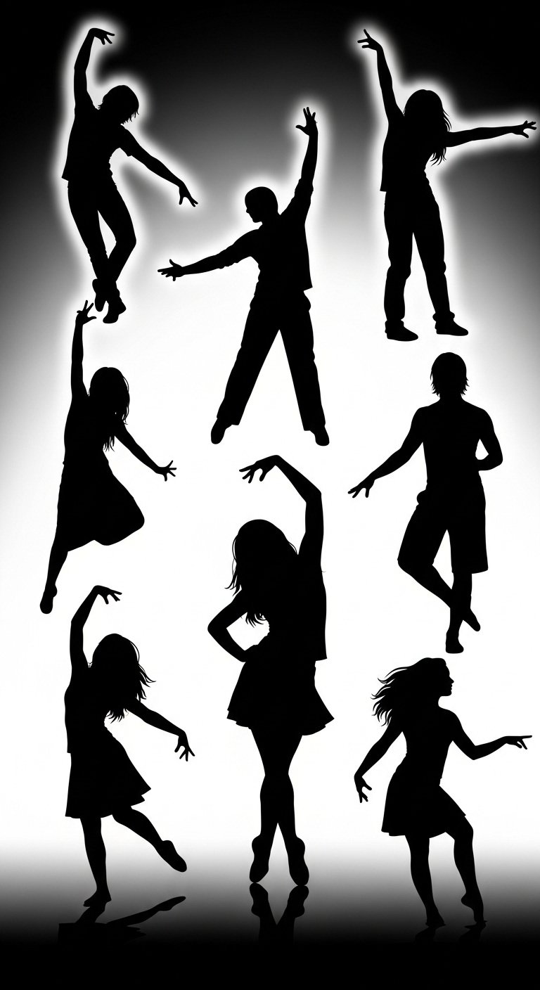 Flowing black silhouette figures mid-leap and spin, layered with faint motion blur and subtle ink splashes to suggest music-driven movement; varying figure sizes and poses create rhythm across the skin, framed by thin negative-space lines to hint at stage lights; minimalist grayscale with one accent color (deep teal or warm amber) for energy.