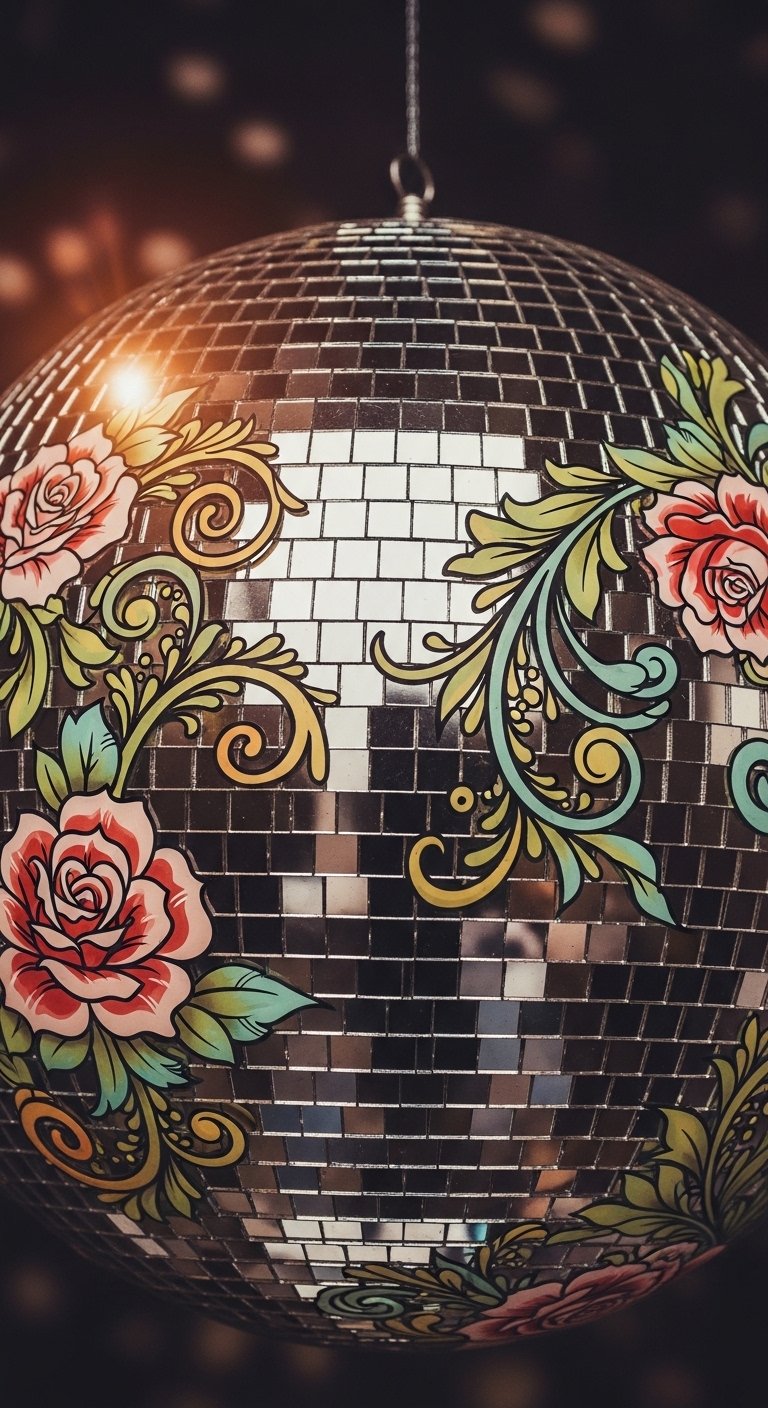 This design juxtaposes reflective geometric disco-mirror facets with organic, swirling florals to symbolize the balance between celebration and natural beauty; placement on the upper back or shoulder allows the round disco-ball motif to sit like a radiant focal point, while stems and petals cascade toward the arm or collarbone to evoke movement and freedom, creating an uplifting emotional impression of joy, individuality, and lighthearted confidence.