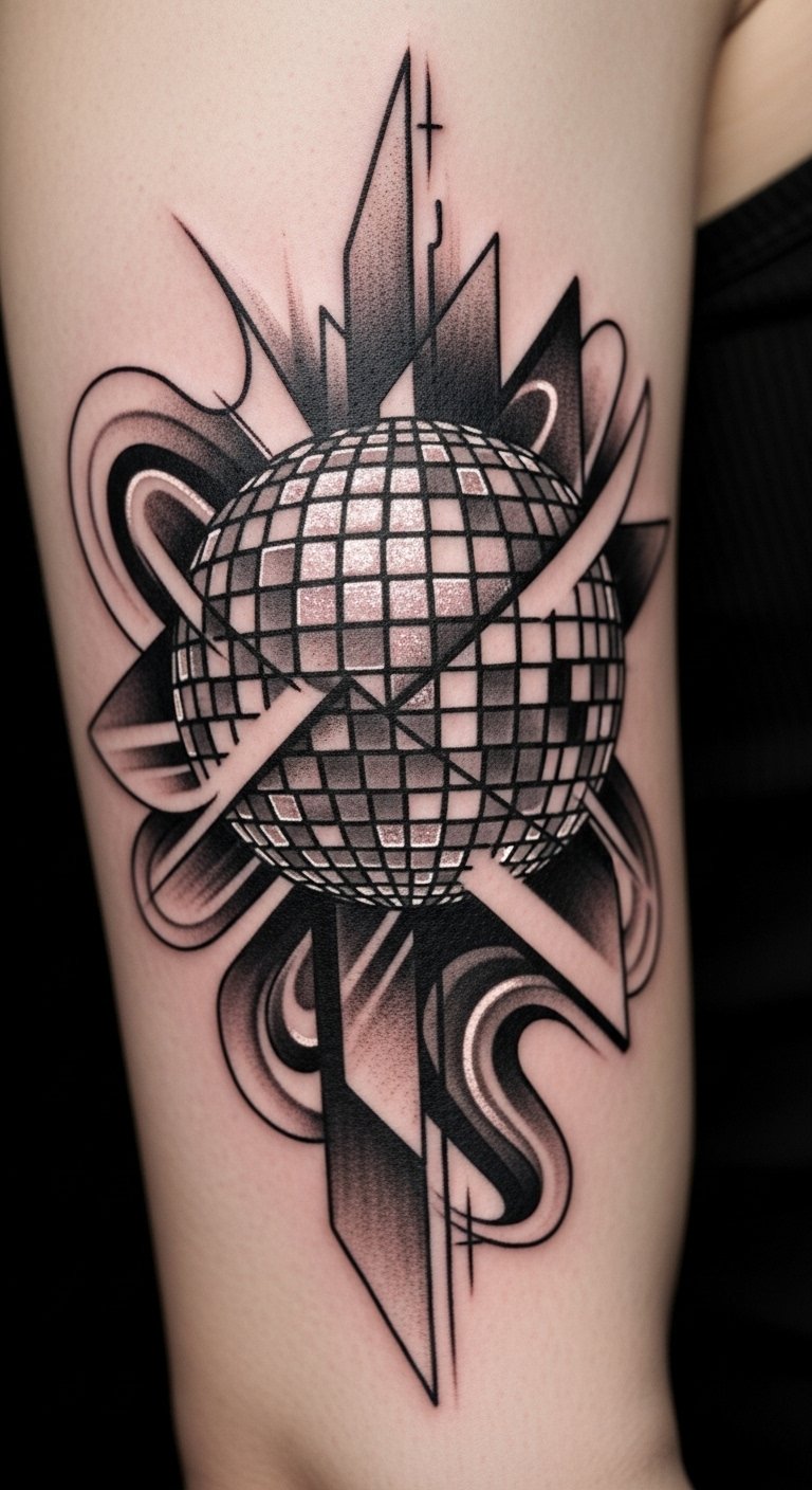 This design combines mirrored disco facets with layered geometric patterns—tetrahedrons, concentric circles, and flowing abstract ribbons—rendered in high-contrast blackwork and metallic dotwork highlights; fine line detailing creates a sense of light and motion. Symbolically, the disco-ball geometry represents the many facets of self and the joy of self-expression, while the fluid shapes convey movement, liberation, and the emotional brightness of celebration. Ideal placements include the shoulder blade, forearm, or side rib where the piece can curve with the body and catch light as you move, inviting attention and personal resonance.