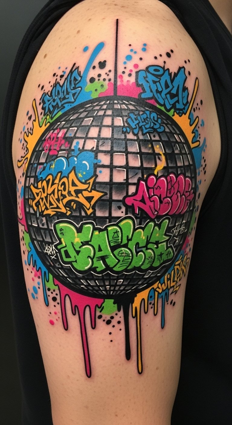 When you think of a graffiti-style disco ball tattoo, imagine a vibrant explosion of colors and urban artistry that captures the essence of nightlife and self-expression.