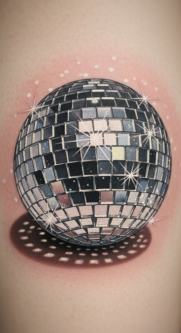 The mirrored facets suggest a multifaceted personality and a life lived to music, evoking nostalgia, playful confidence, and quiet rebellion depending on size and finish—tiny dotwork for subtlety, micro-realistic shine for secret glamour—each placement balancing visibility with personal significance.