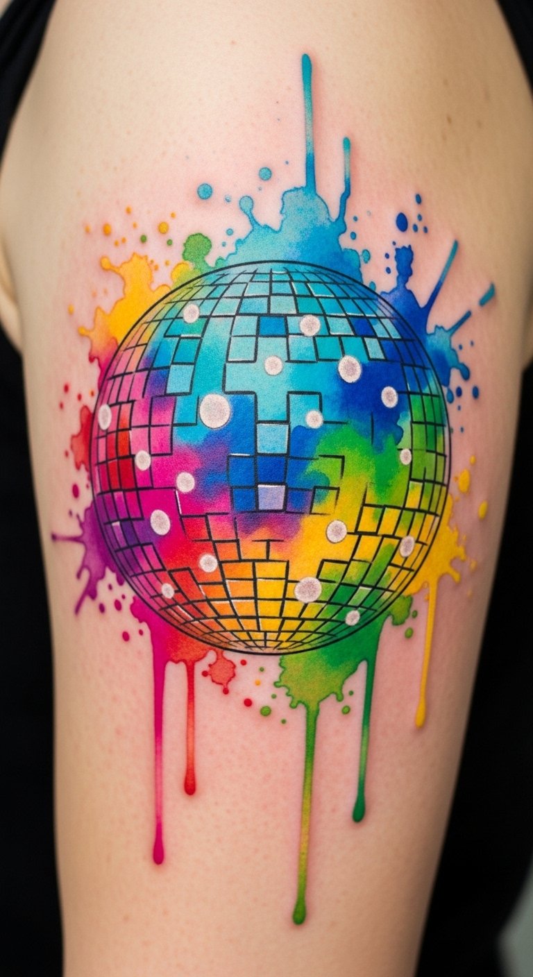 A swirling watercolor disco ball design that blends bright magentas, electric blues, sunny yellows, and emerald greens into liquid reflections, with soft splashes and drips radiating outward; delicate white highlights suggest mirrored facets while loose brushstroke halos create motion — ideal for the upper arm, shoulder blade, or calf to let colors flow with muscle contours.