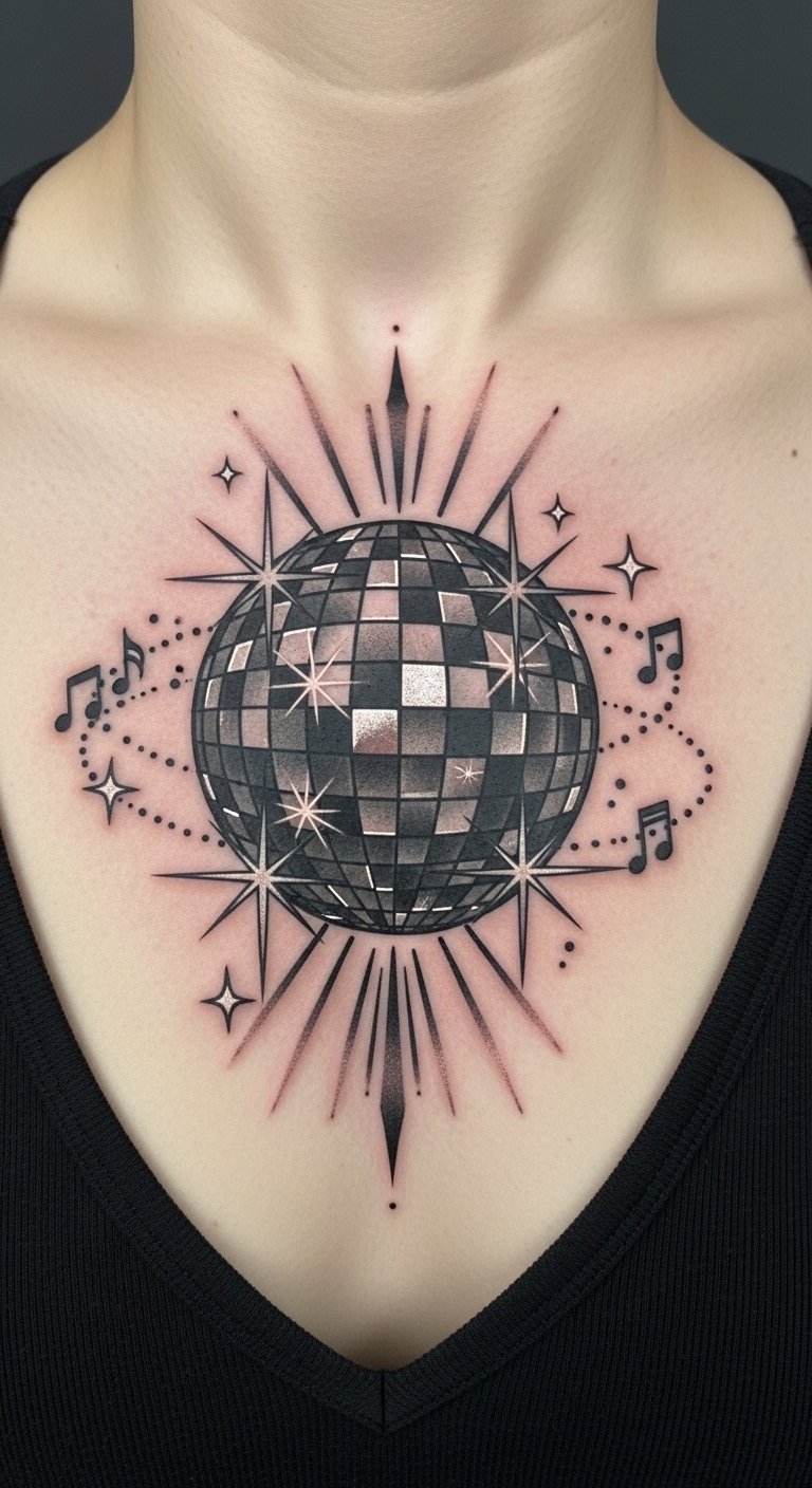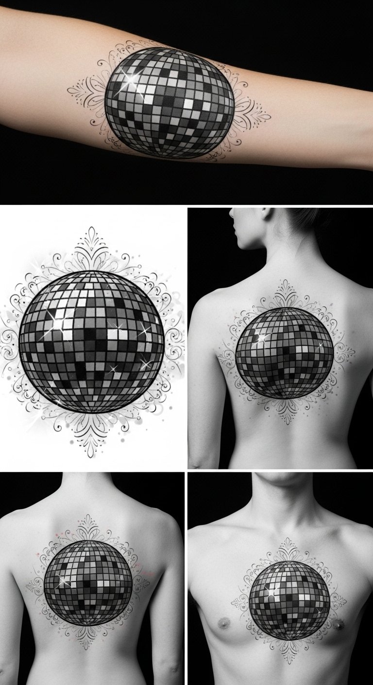 Transform your back or chest into a dazzling canvas with striking disco ball tattoos that capture both your love for music and your unique personality. A stunning back piece can radiate energy, while a bold chest piece makes a statement, showcasing your free spirit.