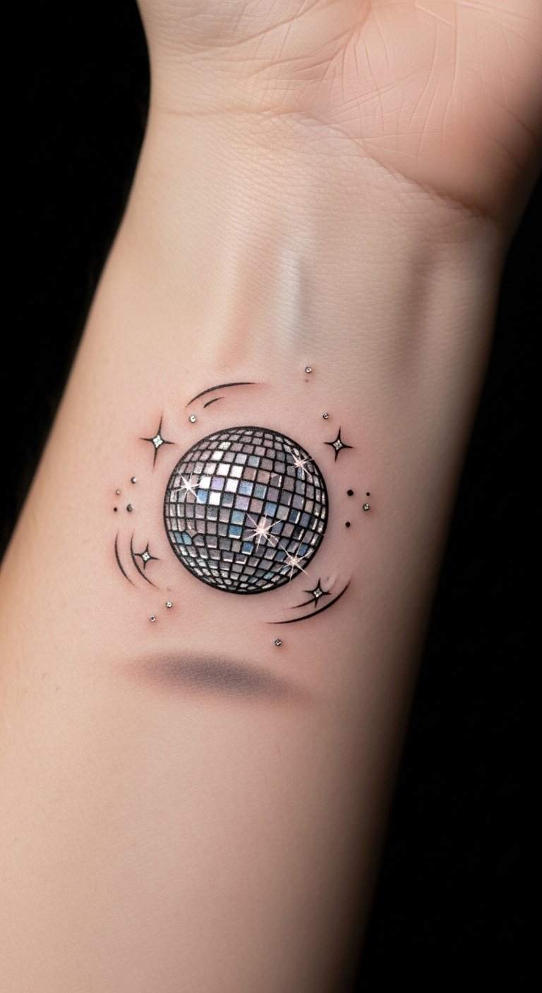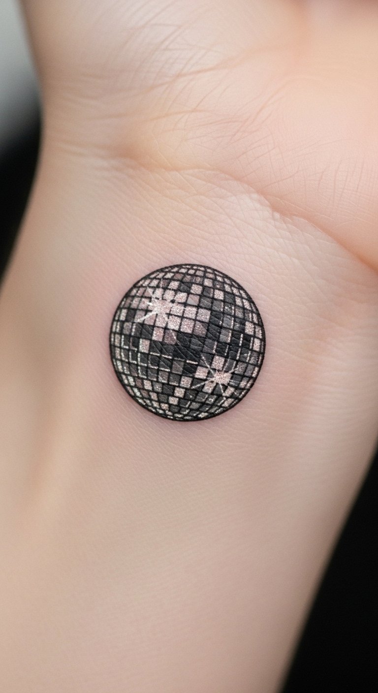 A small wrist disco ball tattoo radiates charm and playful elegance, making it a perfect accessory for those who appreciate subtle yet eye-catching body art.