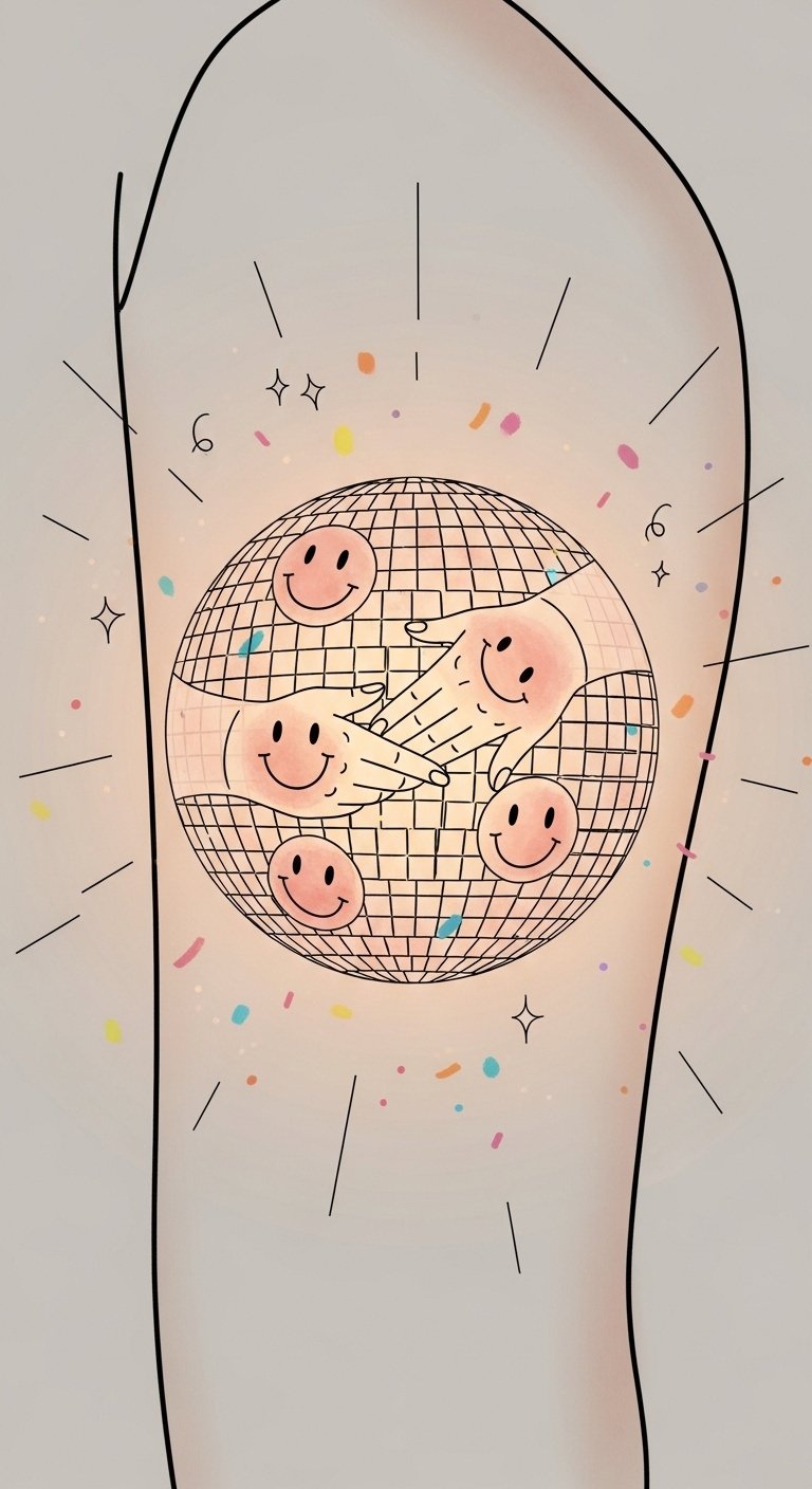 Hidden disco ball tattoos symbolize an intimate celebration of rhythm and self-expression; placed behind the ear they catch soft light as a private reminder of joy, while on the wrist they offer a discreet, wearable talisman of freedom and movement.