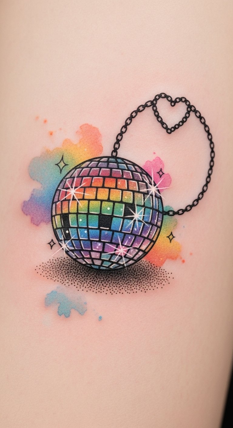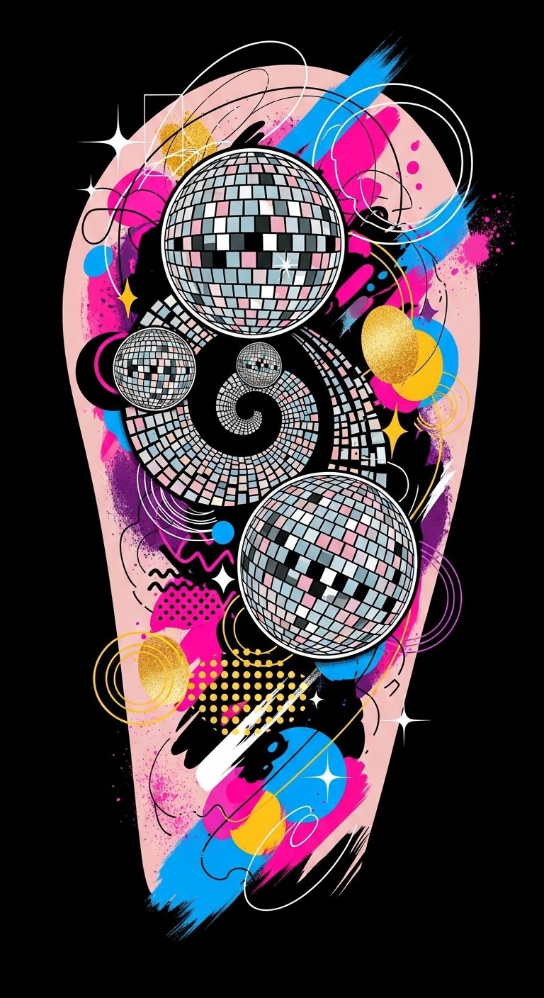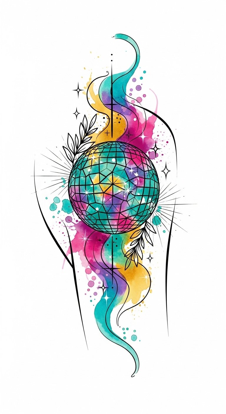 A tattoo concept that channels the classic mirror ball’s reflections into swirling, colorful light patterns across the skin; the design’s vibrant hues and merging ribbons represent joyful movement and the energetic pulse of disco, evoking freedom and celebration.