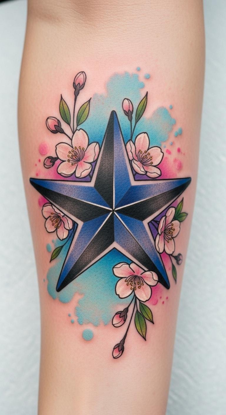 Nautical star tattoos adorned with floral accents create an enthralling fusion of maritime symbolism and natural beauty. The floral integration softens the star’s bold lines while enhancing its meaning, embodying hope and renewal.