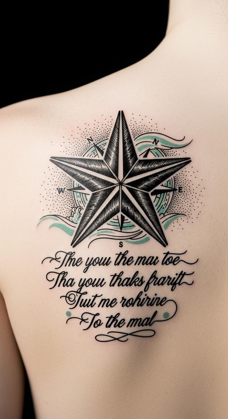 A nautical star tattoo paired with a meaningful quote can transform a simple design into a profound statement of personal values and life experiences. By integrating quote inspiration, you amplify the nautical star symbolism of guidance and hope. Choose words that resonate with your journey, enhancing the tattoo’s message and reminding you to navigate life’s seas with courage and purpose. This placement allows the star to sit prominently for visibility or be covered as desired; the design evokes steadiness and direction, while the script adds intimacy and personal meaning—ideal for someone seeking a reminder of resilience and purpose.