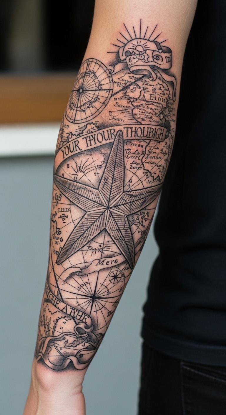With strategic sleeve tattoo placement, these designs showcase nautical star symbolism, representing hope and direction. Bold lines and contrasting colors draw the eye, while intricate details allow for personal expression, making each sleeve a unique tribute to your journey through life’s unpredictable seas.