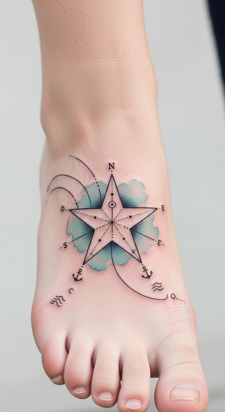 As you explore the world of nautical star tattoos, consider the unique appeal of foot placements for these designs. A foot tattoo beautifully showcases the nautical star symbolism, embodying guidance and protection.