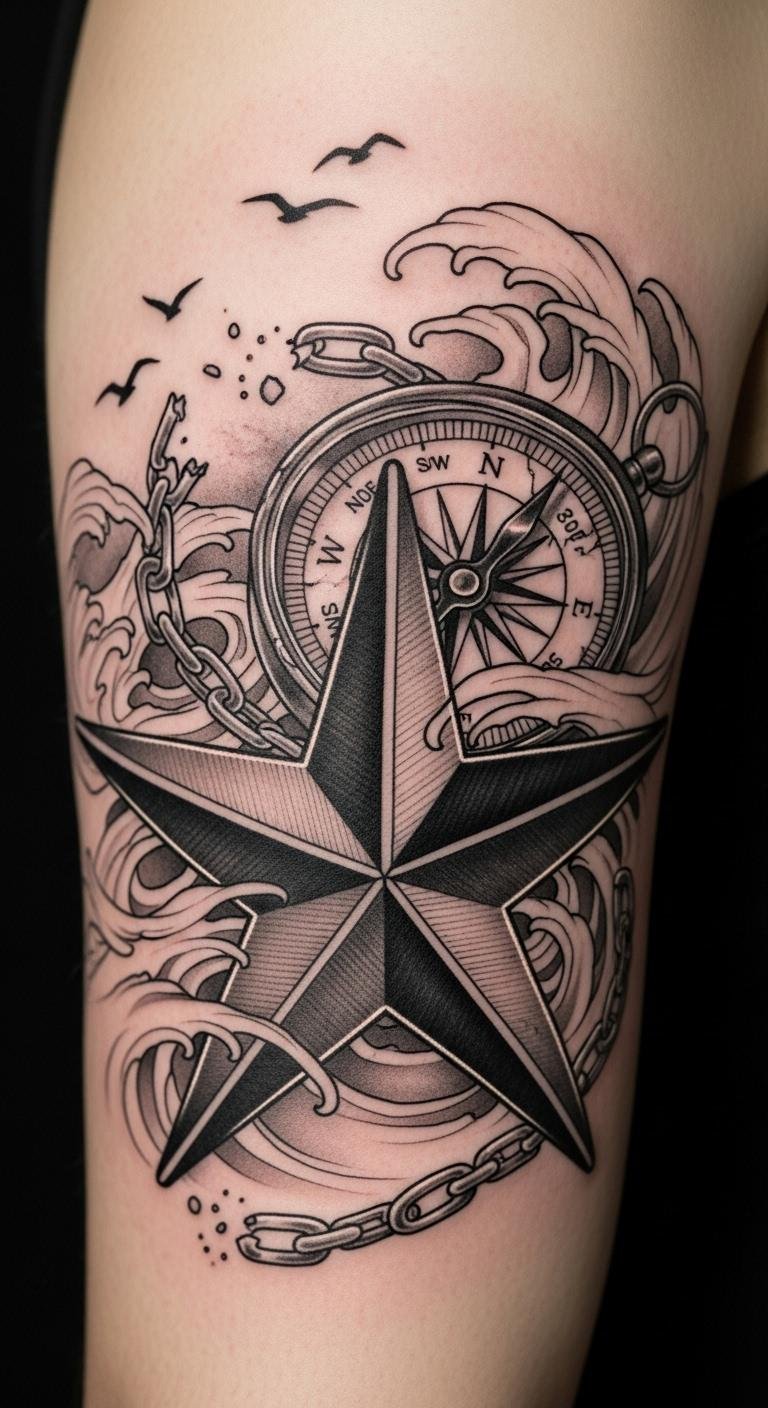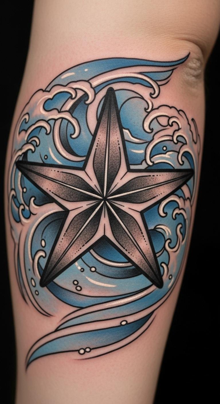 Nautical star tattoos paired with ocean waves create a striking visual narrative that embodies the essence of maritime adventure.