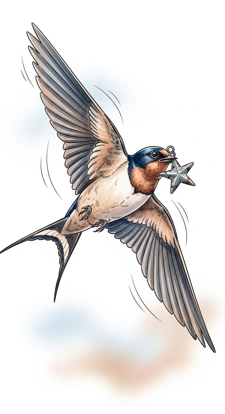 The swallow, steeped in rich symbolism, represents safe travels and returning home, while the nautical star, rooted in maritime origins, offers direction. Together, they create a powerful narrative of adventure, encouraging you to embrace your journey and navigate life’s uncharted waters with confidence.