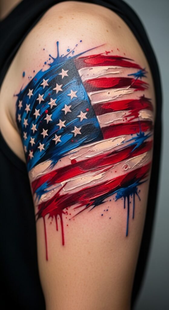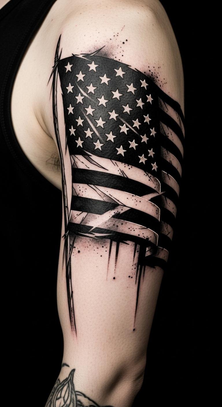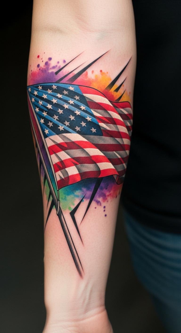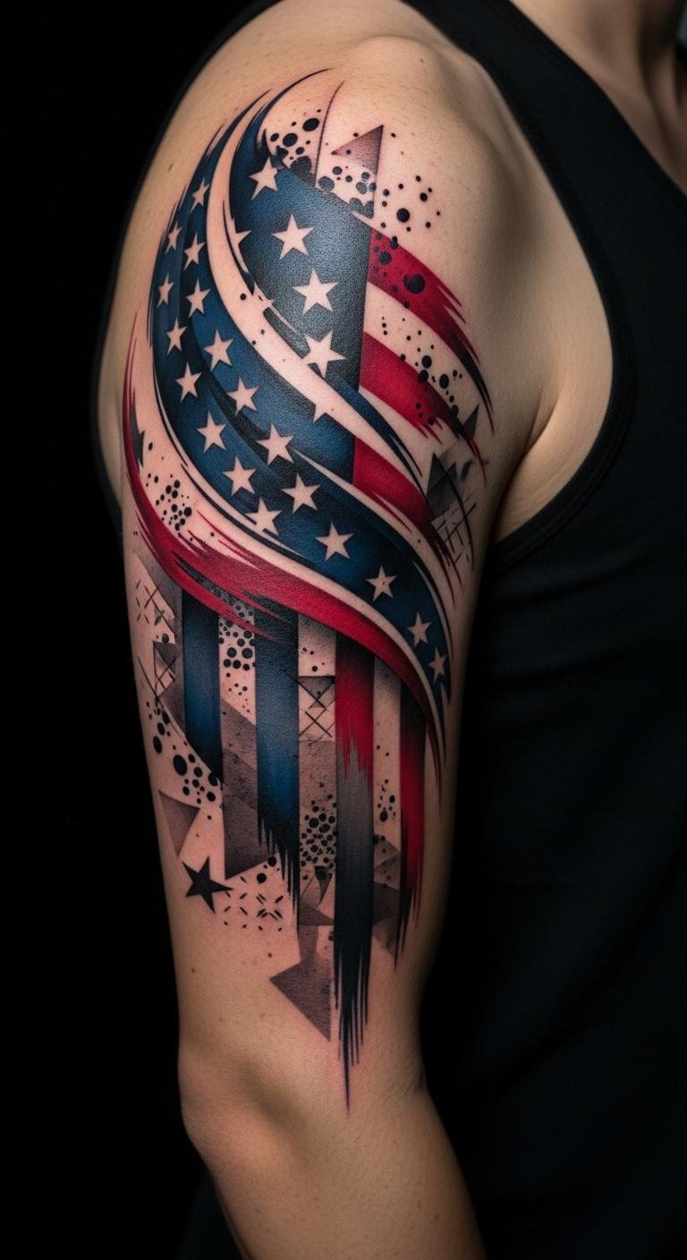 This tattoo concept uses fragmented stripes and negative-space stars to symbolize personal reinterpretation of national identity, the vibrant palette conveying passion and resilience, and the layered planes suggesting movement toward the future; emotional tone is bold yet contemplative, suited to a forearm for visibility and statement, shoulder for breadth and flow, or chest for intimate, close-to-heart meaning.