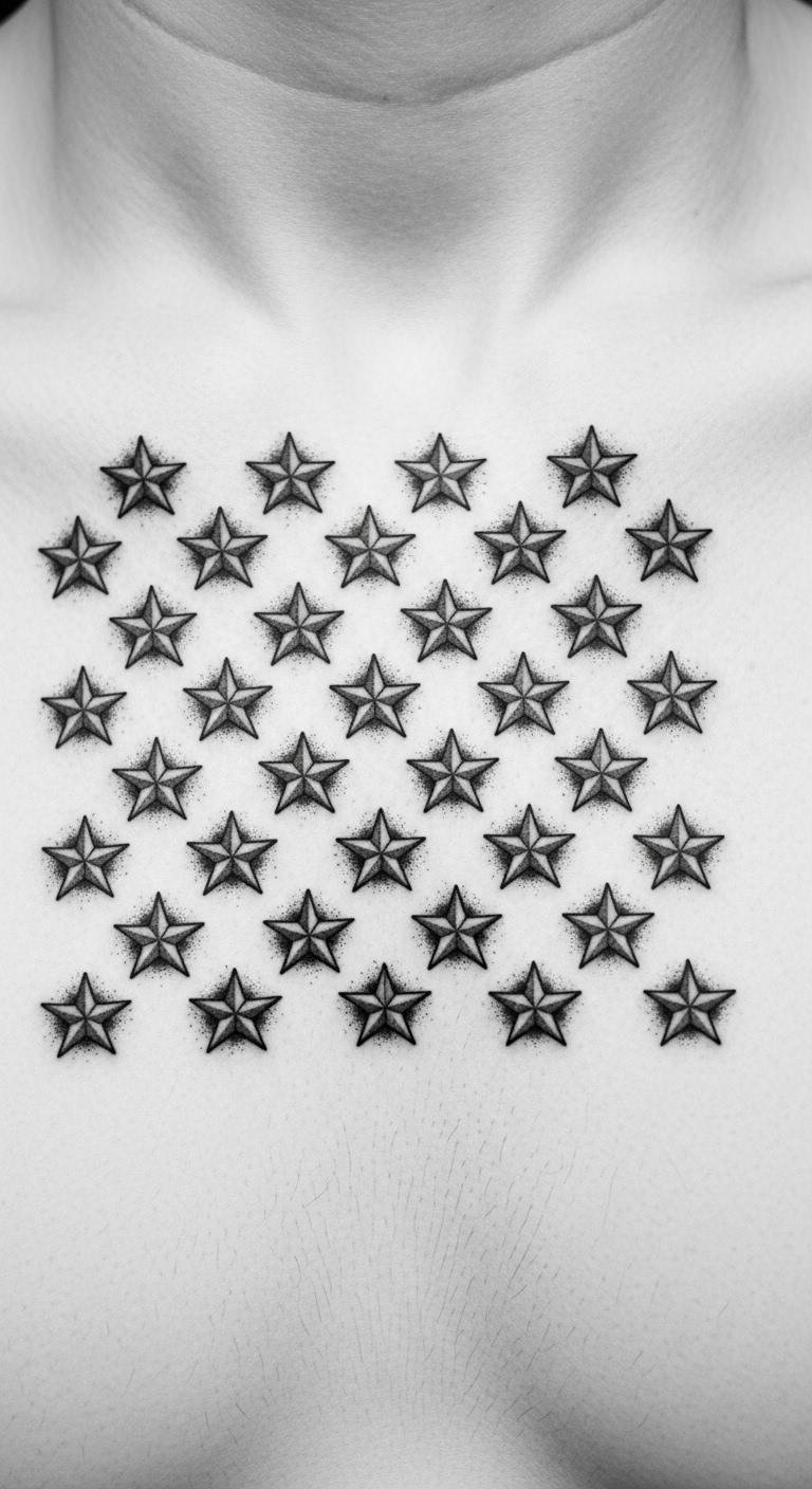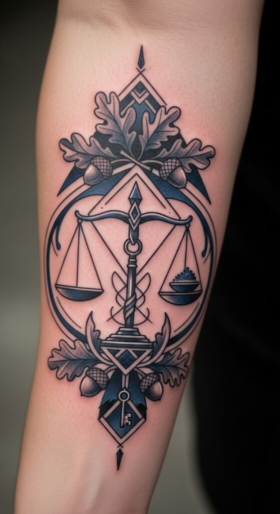 Recommended placement: forearm for visibility and statement, upper chest over the heart for personal commitment, or shoulder blade for a more private emblem; use a size that allows the scale’s details and the stitch-like stars to remain crisp.