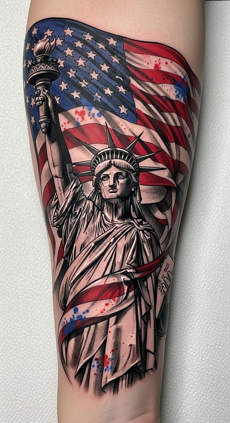 A tattoo featuring the Statue of Liberty entwined with the American flag serves as a powerful emblem of freedom and hope.