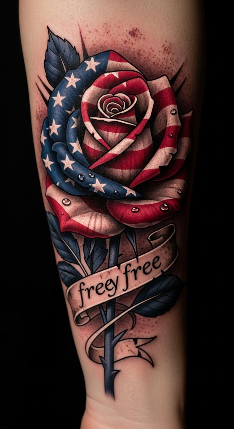 Emotional tones run from solemn respect to proud celebration, suitable for veterans, first responders, or anyone honoring national ties. Recommended placement is the outer forearm or upper chest where the rose can be scaled for detail and visible as a statement piece that moves with the body, allowing the interplay of light and shading to enhance realism.