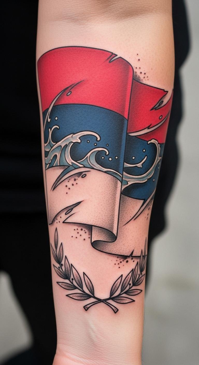 Embracing these color meanings makes your tattoo a powerful statement of pride and identity. This forearm placement lets the flag flow with arm movement, the laurel and waves reinforcing triumph and perseverance; emotionally it reads as resolute and proud, meant to be visible yet personal, sized to wrap slightly around the inner forearm for daily reminder and ceremonial presence.