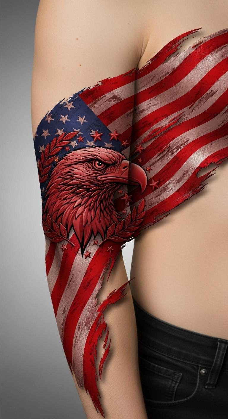 A full-sleeve arm tattoo centered on a large, waving flag rendered in vivid red, white, and blue, framed by laurel leaves and classical filigree; integrated elements include a silhouetted soldier, an eagle in mid-flight above the flag, and subtle script of a meaningful motto woven into a banner; high-contrast shading, fine-line detail for texture, and selective watercolor splashes to accentuate motion and depth. This design symbolizes honor, sacrifice, and collective identity, evoking pride and reverence while allowing personal connection through the chosen motto; ideal placement is the upper arm wrapping into the shoulder to emphasize strength and visibility, with the option to extend toward the forearm for a continuous narrative.