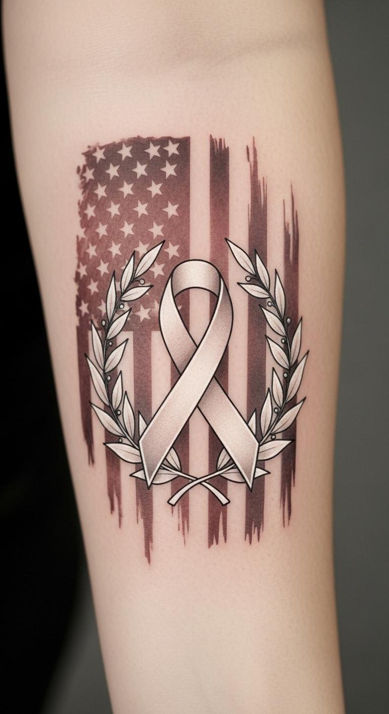 When you wear a tattoo featuring this color, you celebrate these values, reminding yourself and others of the enduring commitment to justice and unity. The design uses white ink and negative space to evoke subtlety and quiet strength, the laurel for honor and the ribbon for remembrance, creating an emotional balance between hope and solemn dedication; ideal placements are inner forearm for personal visibility, chest over the heart for intimate meaning, or behind the shoulder for a more private, steady presence.