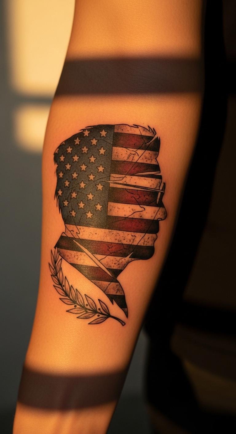 By choosing a tattoo that embodies this valor representation, you’re not just showcasing pride; you’re celebrating the unwavering strength of America. The design uses the flowing crimson stripe to convey motion and continuity—endurance—while the eagle in negative space anchors valor and vigilance; laurel etchings and distressed stars add historic honor and lived struggle, creating an emotional balance of pride and solemn remembrance.