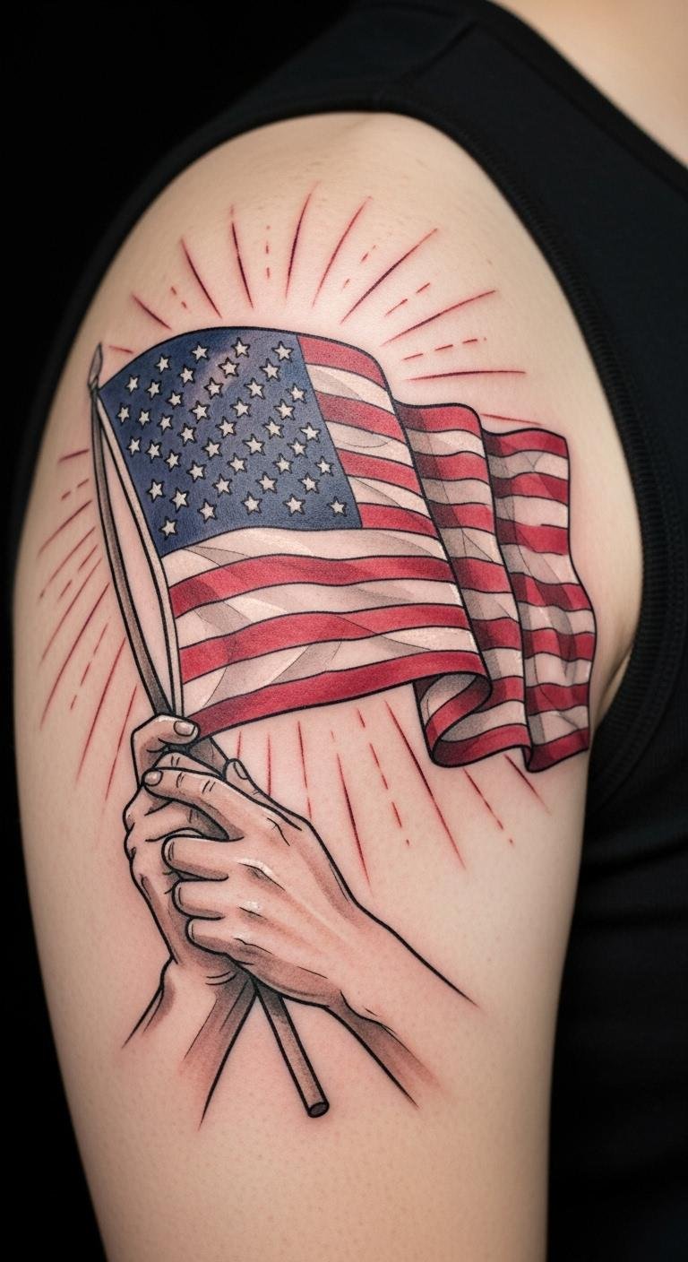 The imagery of hands cradling the flag evokes protection and stewardship, the watercolor tones soften patriotism into personal reflection, and the sunburst suggests hope and renewal; ideal placement on the upper chest aligns the symbol with the heart, while the upper arm offers visibility and dignity, conveying both collective identity and intimate devotion.