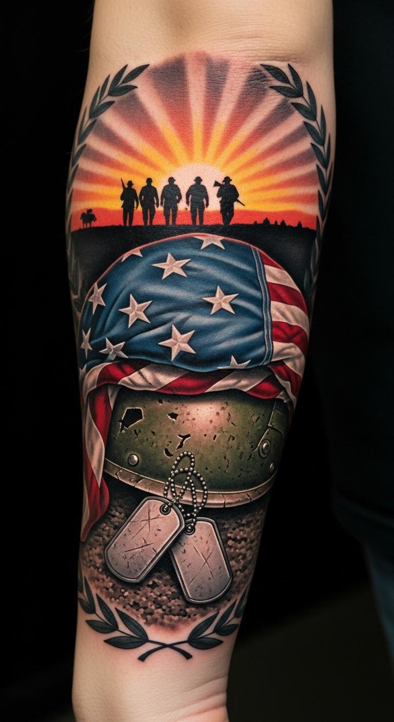 This design symbolizes honor (folded flag, helmet), remembrance (dog tags, marching silhouette), and unity (laurel wreath and rays). Emotionally it conveys solemn pride and solidarity; ideal placement is the mid-forearm for visibility and easy wrapping with the natural contours of the arm to allow the flag and silhouette to flow with movement.
