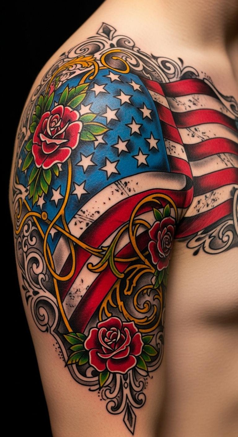 Ideal placement is a shoulder-to-chest wrap where the flag’s movement can follow musculature, with flowers or scrollwork extending toward the collarbone and upper arm for balance and visibility.