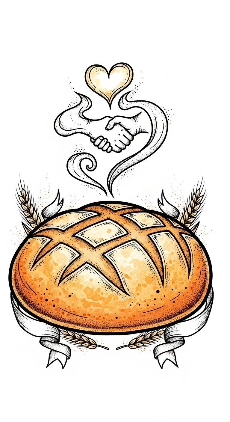 This tattoo concept uses the artisan loaf as a central emblem of nourishment and togetherness; the steam morphing into a heart and handshake emphasizes emotional warmth and shared connection, while the wheat stalks and ribbon banners frame the image and add a sense of community and continuity.