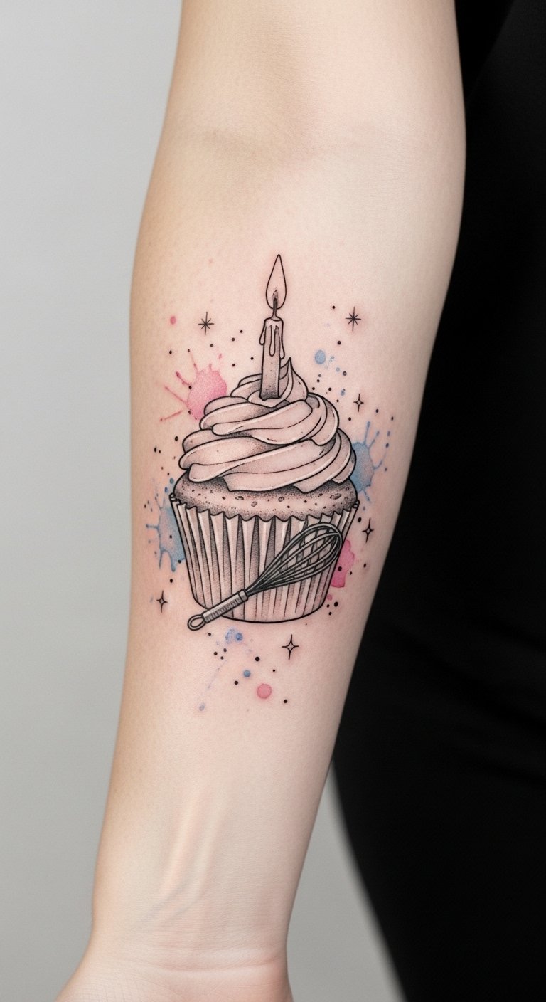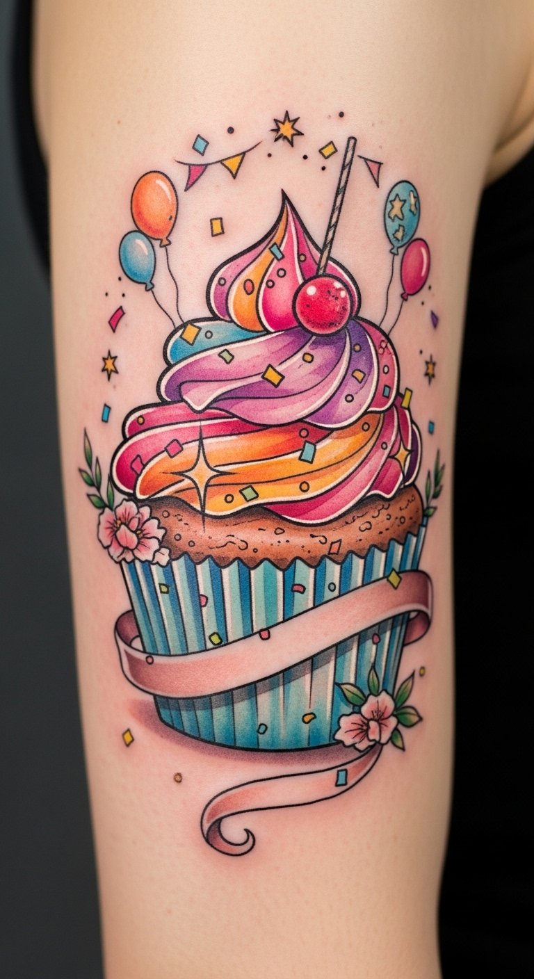 Let your imagination run wild, and watch as cupcakes elevate the occasion to unforgettable heights! This tattoo symbolizes joy, festivity, and personal sweetness—frosting swirls for individuality, confetti and stars for memory-making moments, and the ribbon for ties to loved ones.