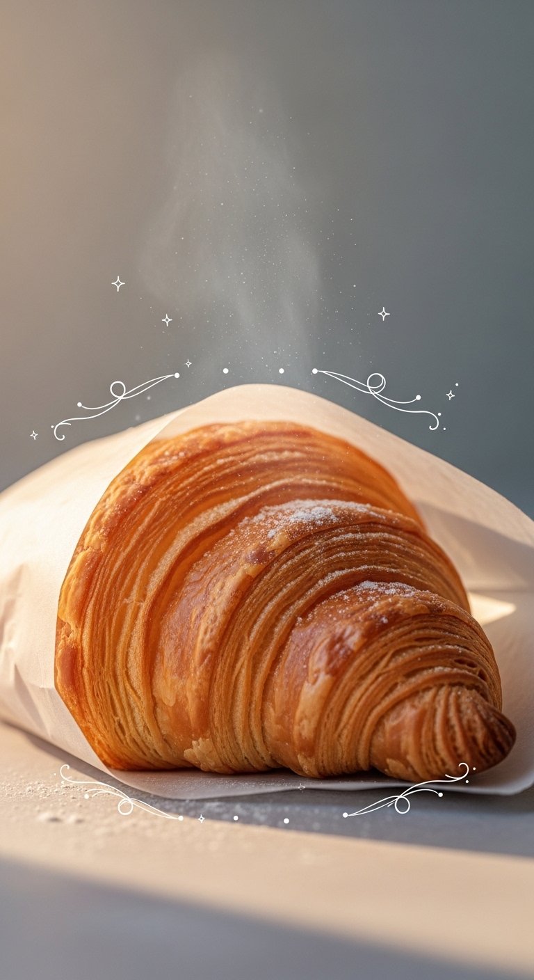 This design concept channels the original text’s celebration of croissant tattoos by focusing on sensory detail and warmth: the photorealistic croissant evokes indulgence and craftsmanship, the parchment and steam suggest freshness and morning ritual, and the ornamental flourishes add a delicate, wearable elegance.