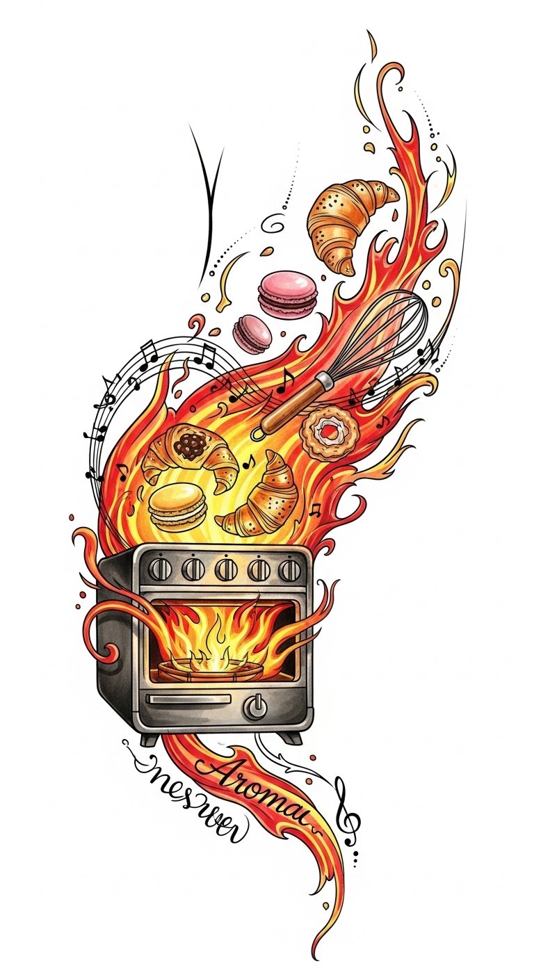 This design blends warmth and motion to symbolize creative birth and devotion to craft—the oven flames represent transformative energy, the pastry-shaped fire elements signify skills and creations born from that heat, and the whisk and aroma lines evoke the senses and rhythm of baking.
