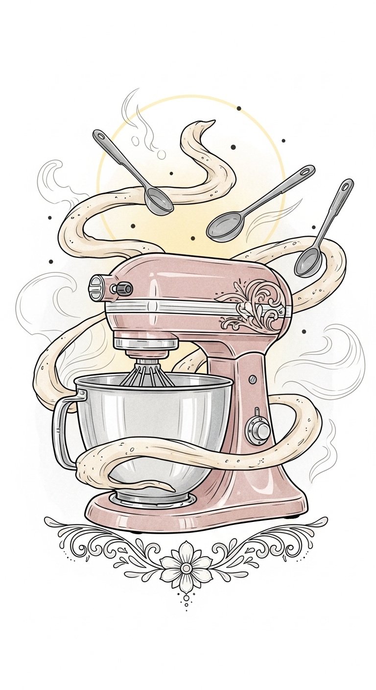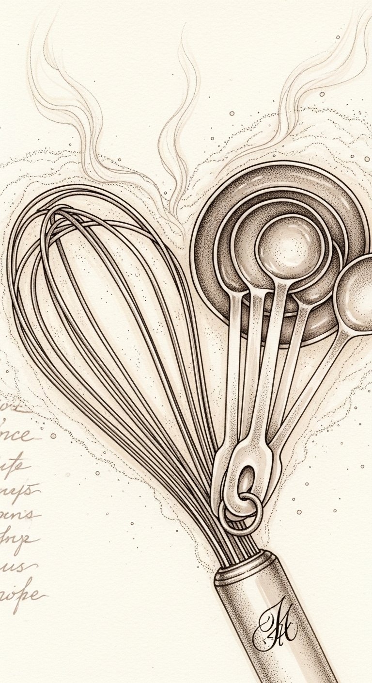 This design uses the heart-shaped tool arrangement to symbolize love and connection, the steam-like flour swirls to evoke warm memory and motion, and the handwritten recipe fragment to anchor personal history; emotionally it balances comfort and joyful precision.