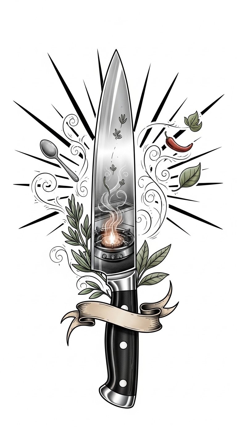 Embrace the knife, and let it inspire your culinary journey. The design symbolizes resilience (the knife), growth and creativity (herbs and steam), and pride in craft (banner and icons); emotionally it conveys empowerment and focus, suited to forearm or calf where its vertical form echoes the body’s lines and the wearer can see it during daily practice.