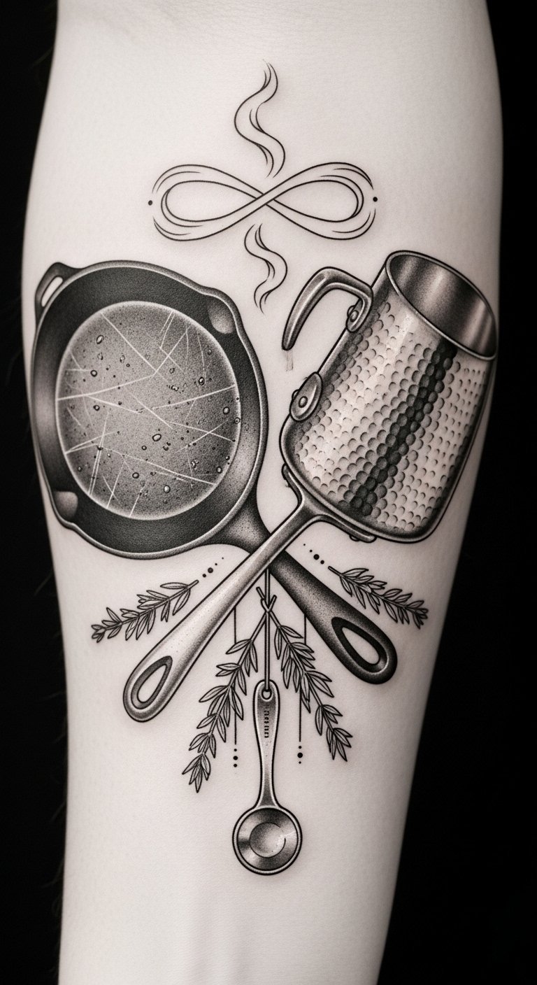 As you stir and sauté, remember that these tools embody your determination, inspiring you to create and explore flavors with freedom. This design uses the worn cookware and infinity-steam to symbolize endurance and ongoing growth, the herb sprigs and spoon as personal tokens of craft and memory; it evokes quiet pride and gentle resolve, ideal for placement along the inner forearm where it can be seen easily and recalled during moments of focus.