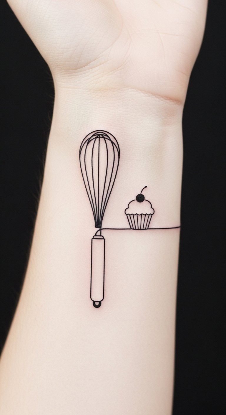The whisk and cupcake together symbolize the blend of craft and comfort in baking, conveying warmth, dedication, and a gentle pride in one’s culinary practice; the delicate line work evokes quiet confidence and personal intimacy.