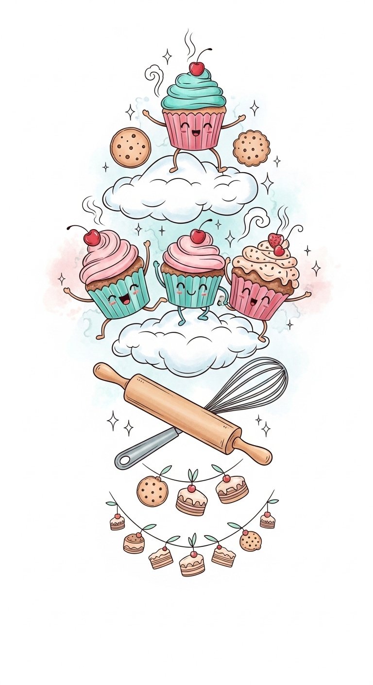 The design symbolizes creative nourishment and the warmth of shared moments; the joyful cupcakes and flour clouds convey playfulness and comfort while the crossed tools represent craft and dedication.