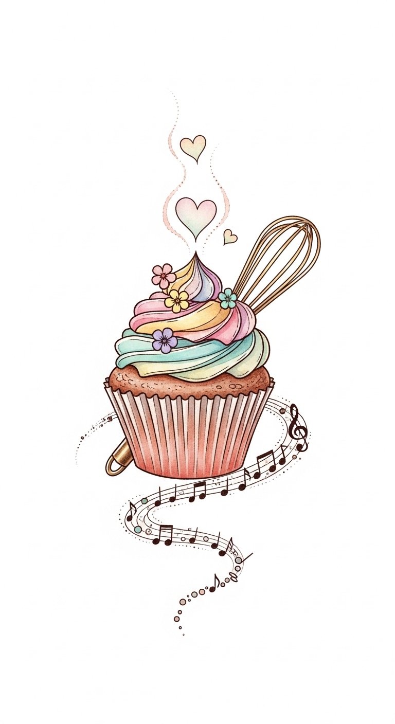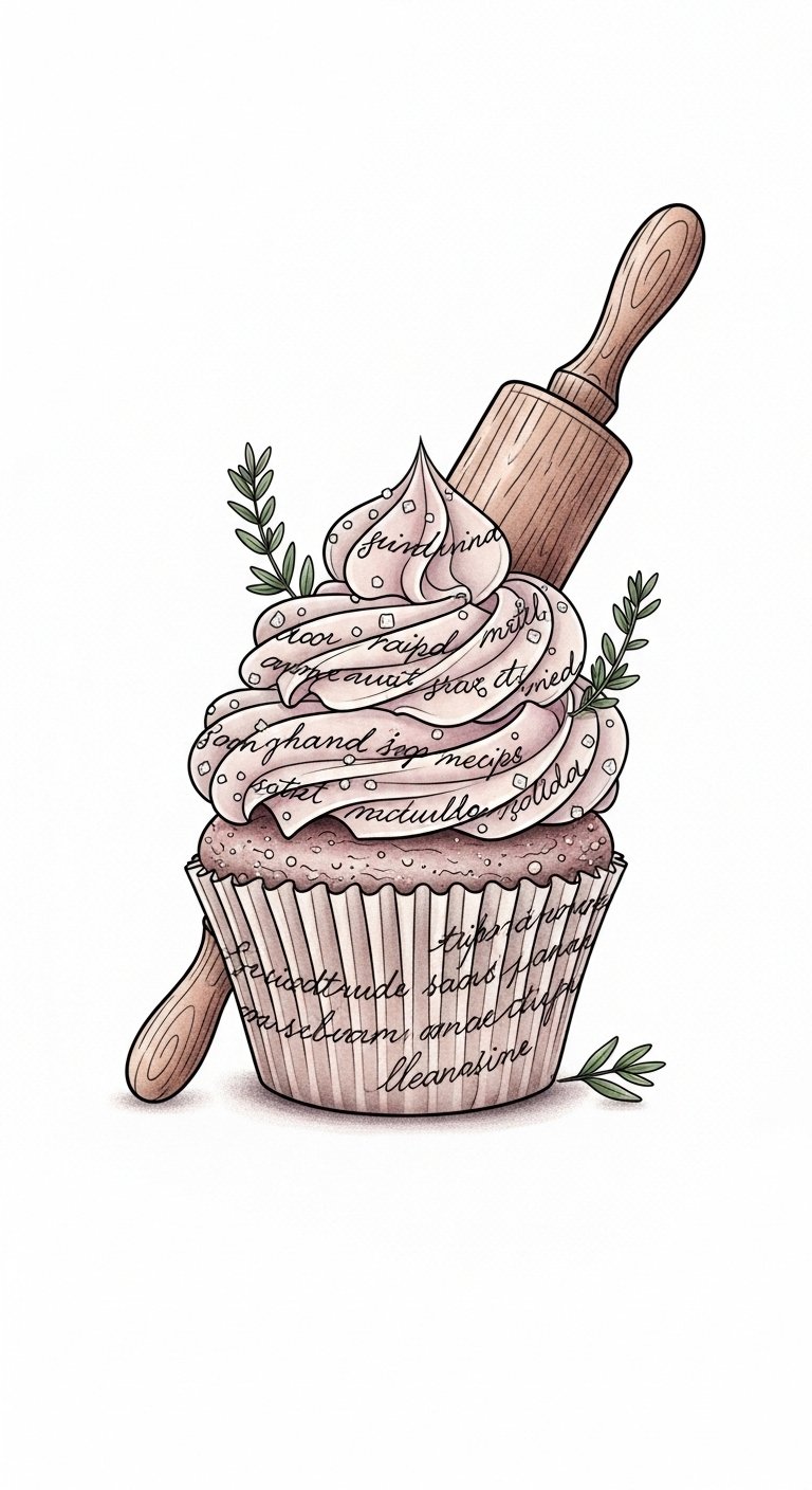 The cupcake and rolling pin together symbolize the blend of personal sweetness and family tradition—frosting swirls trace childhood sugar stories while the rolling pin grounds the design in shared recipes and heritage; the tiny sugar highlights and herb sprigs evoke sensory memories of taste and scent, and the faint script winding through the frosting holds the emotional weight of specific moments and people.