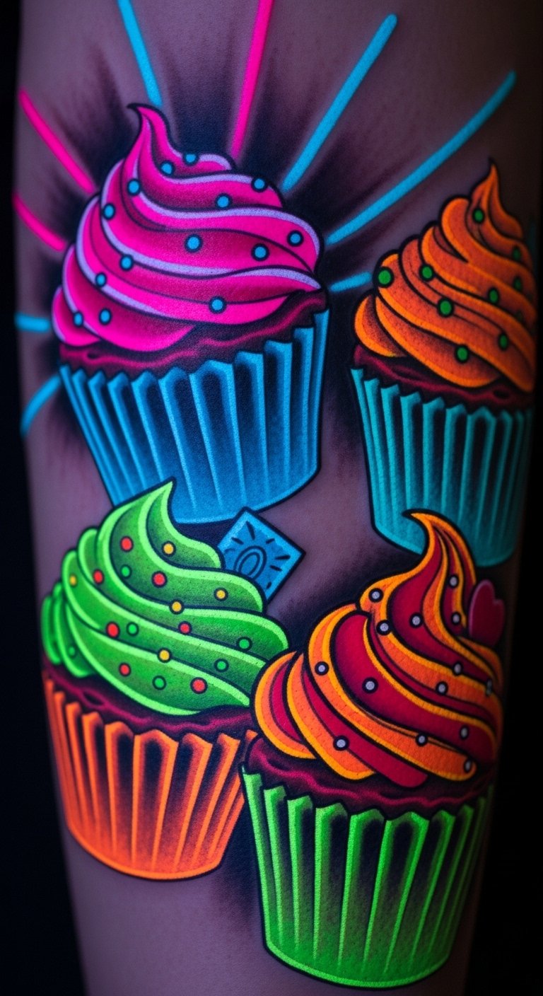These neon cupcake tattoos symbolize joy, playfulness, and self-expression, using glowing hues to evoke the effervescence of celebration and the warmth of shared treats; emotionally they project confidence and a whimsical openness, making them ideal for visible, intimate placements such as the forearm, ankle, or behind the ear where the bright colors can catch light and invite conversation.