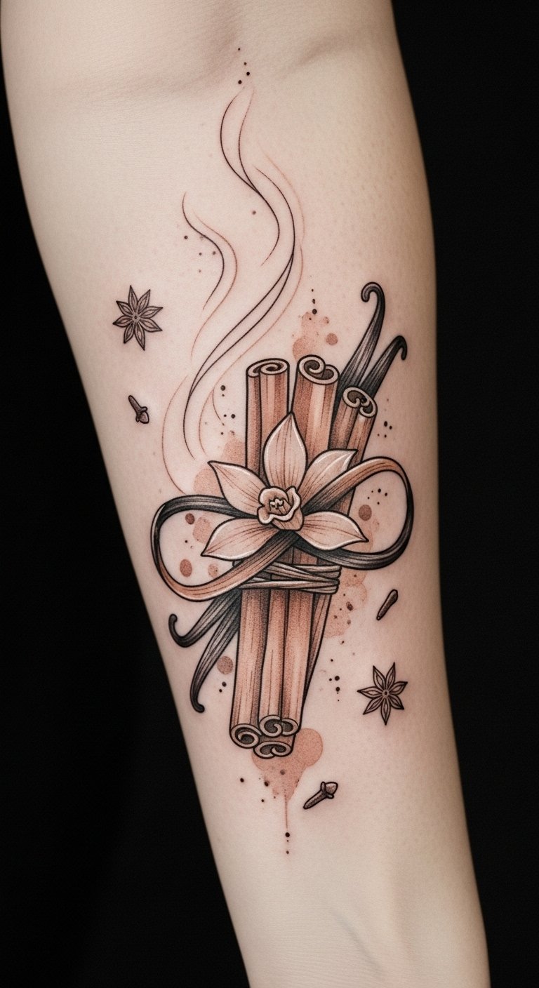 This design uses cinnamon and vanilla as personal emblems—cinnamon as grounding warmth and shared family rituals, vanilla as an endless, comforting presence—while the steam lines suggest memory and the spices scattered like moments.
