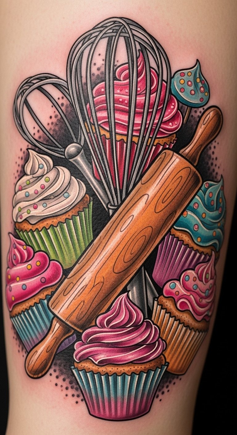 This design weaves whisks and rolling pins around three vibrant cupcakes, each decorated with distinct colors and textures, connected by a ribbon-like swirl of flour dust and tiny heart-shaped sprinkles; place it on the forearm or upper chest where the flowing composition can wrap slightly, symbolizing passion for baking, the continuity of creative practice, and joyful celebration—evoking warmth, pride, and the personal narrative of culinary craft.