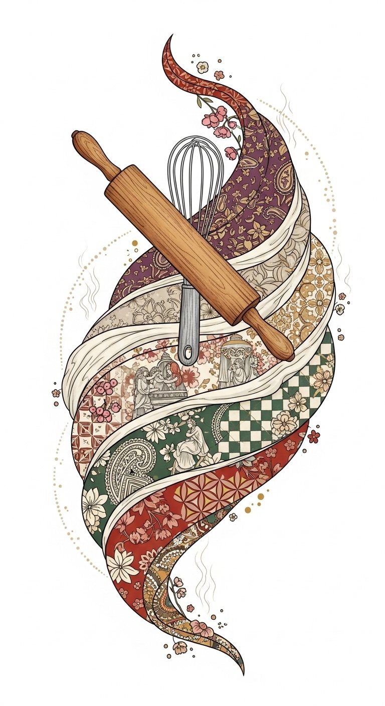 This design symbolizes continuity, craft, and the gentle labor of love inherent in baking; the vintage rolling pin represents heritage and the flourishes and pastry silhouettes signify small moments and creations that make life meaningful.
