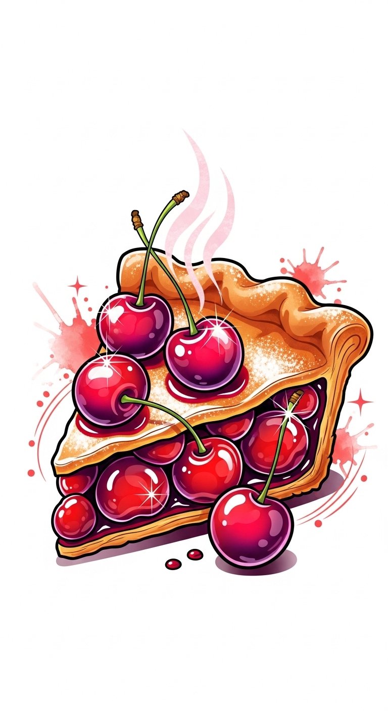 Following the cozy charm of a classic apple pie, the colorful cherry pie slice tattoo bursts with vibrancy and joy. Imagine bold reds and luscious pinks swirling together, capturing the essence of sweet cherry pie.