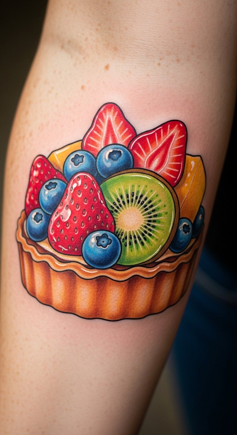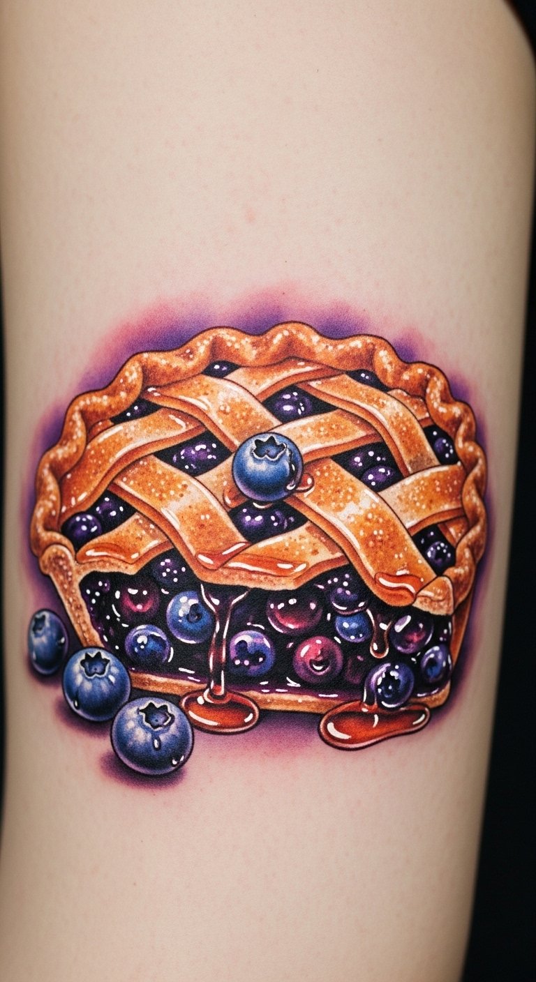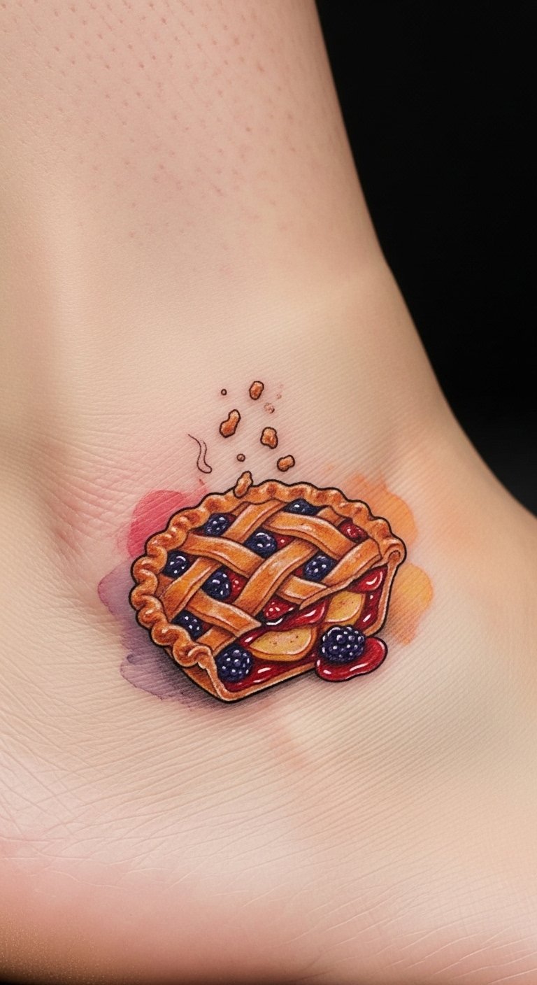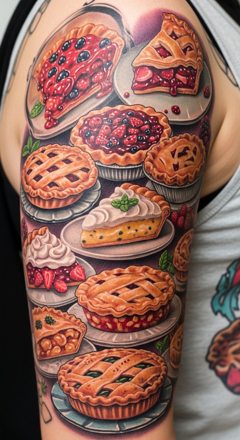Imagine whimsical designs featuring animated pastries, each with cheerful toppings and sweet illustrations that bring life to your skin. These playful pies, resembling cute desserts, capture the essence of food art, inviting joy and creativity into your tattoo collection.