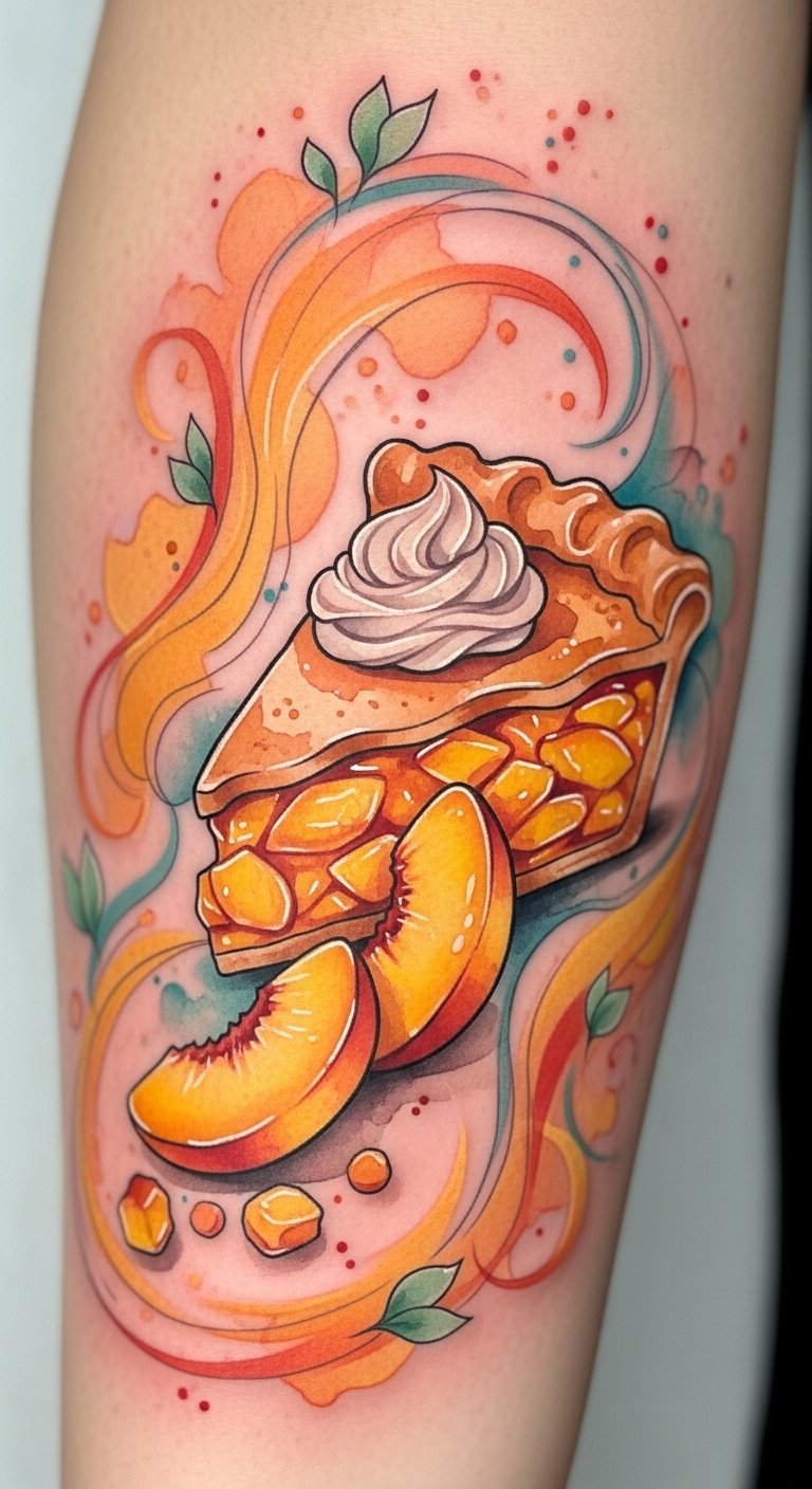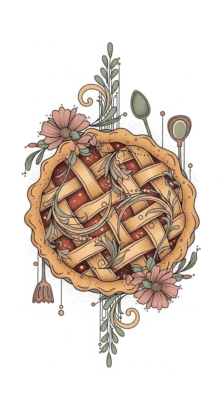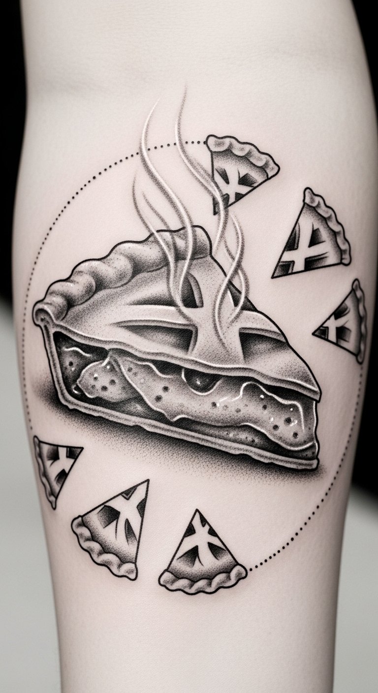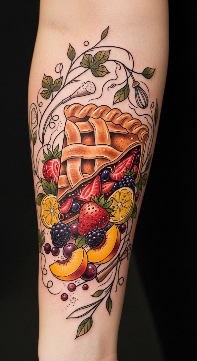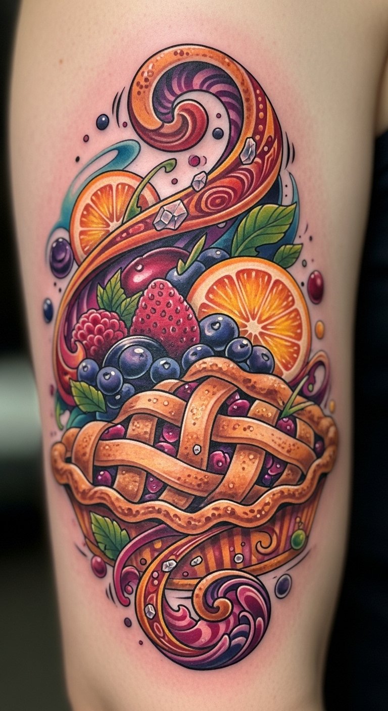This tattoo concept pairs a central stylized pie—golden lattice crust and steaming filling—with surrounding flowing swirls that mimic steam, ribbon, and floral motifs; colors transition from warm amber and cherry red at the pie to cool teal and lavender in the swirls, suggesting movement and taste memory. Symbolically it celebrates comfort, nostalgia, and creative joy; emotionally it evokes warmth, playfulness, and sensory delight. Ideal placement: forearm sleeve wrapping so the swirls curl toward the wrist, or over the ribcage/side to let the designs fan and flow with body contours.
