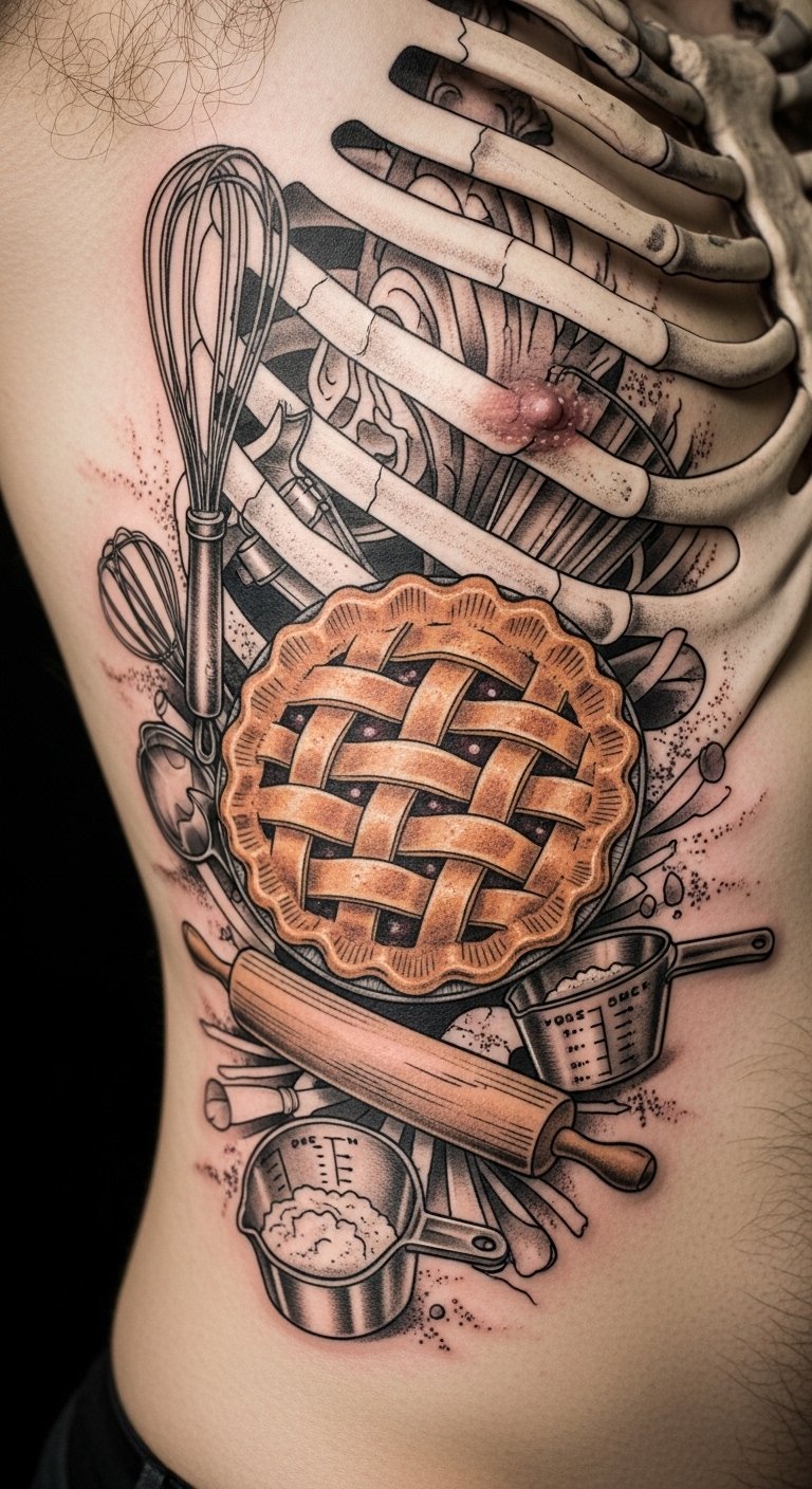 This design places the pie at the center of the ribcage, the crust’s texture echoing the curvature of ribs while whisks, rolling pins, and measuring cups weave between bones like supportive, graceful ligaments; it symbolizes nourishment, craft, and the intimate link between body and passion, evoking warmth, pride, and playful confidence.