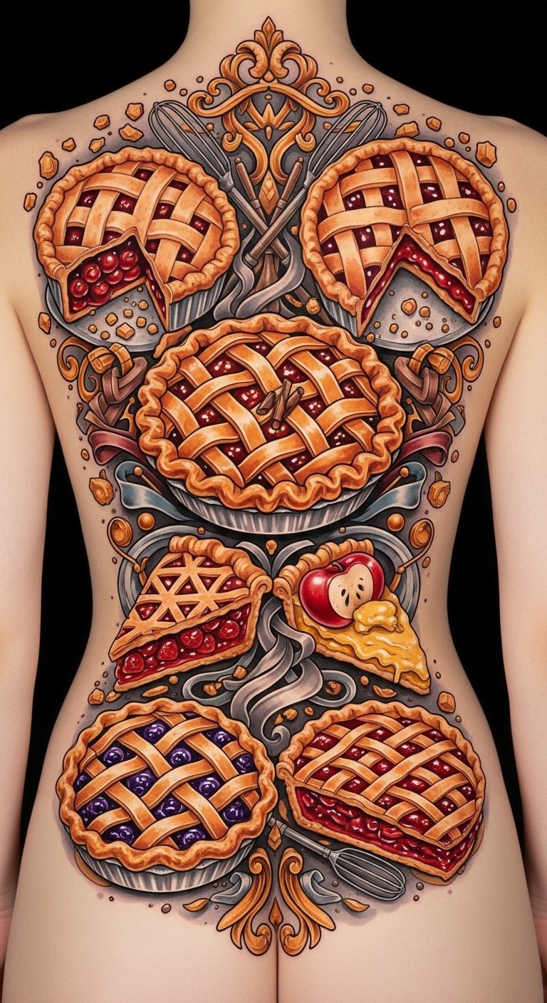 Imagine taking your love for baking to a grander scale with an elaborate pie scene inked across your back.